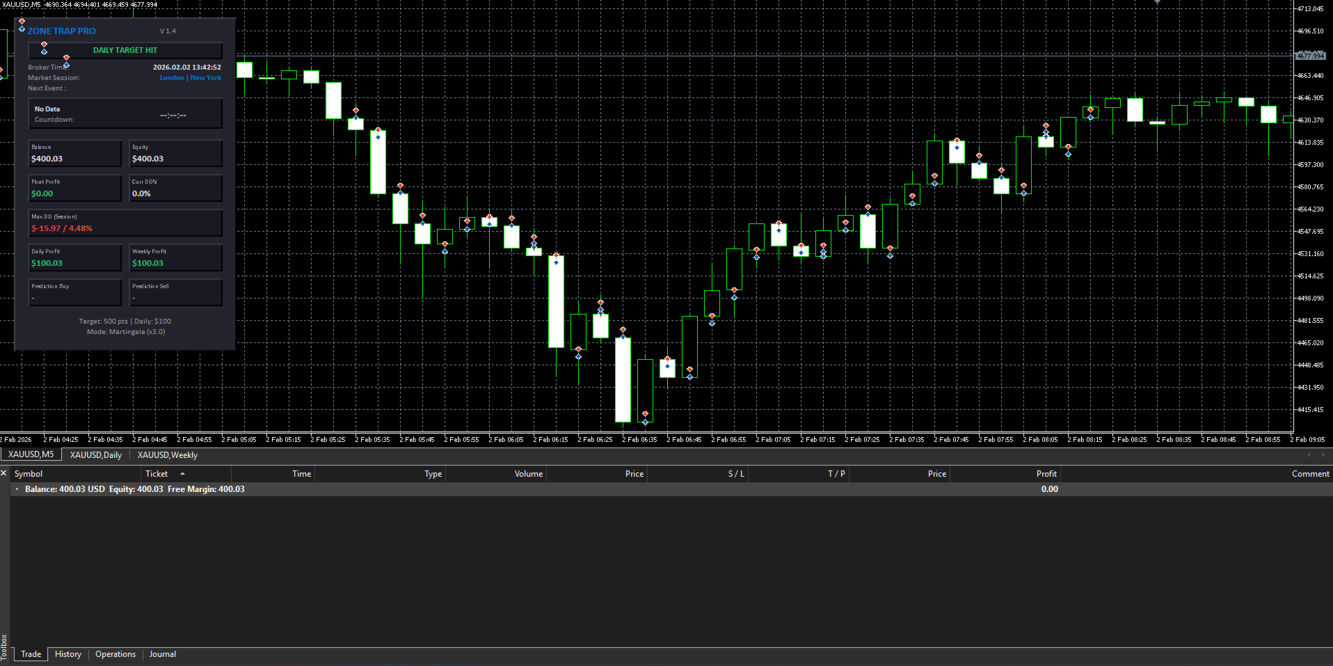 Ausgestattet mit mehrschichtigem Kapitalschutz, intelligenten Filtern für Marktbedingungen und einem futuristischen Dashboard ist Zone Trap Pro bereit, Ihr ultimativer Handelsassistent sowohl für Forex-Paare als auch für Gold (XAUUSD) zu sein.