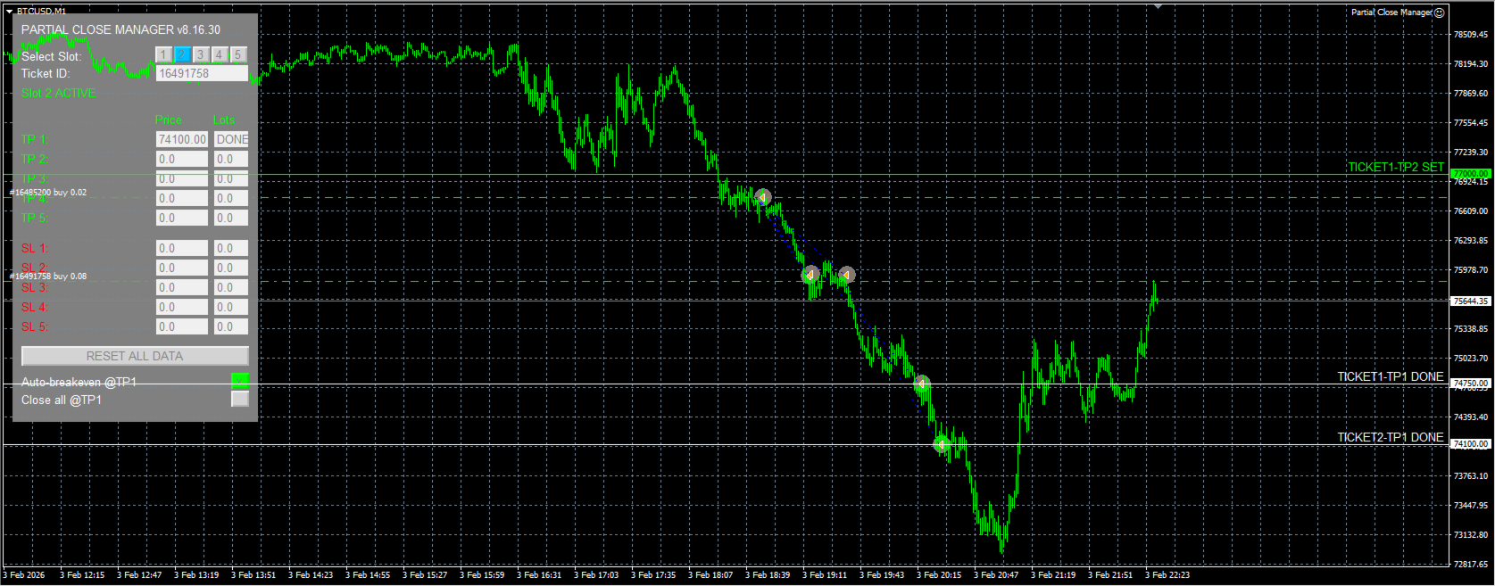 Visuelle Darstellung: Die vom Nutzer festgelegten TP- und SL-Levels werden auf dem Chart durch anpassbare horizontale Linien visualisiert. Die Linien sind entsprechend dem aktuellen Status des jeweiligen Levels markiert (SET/DONE).