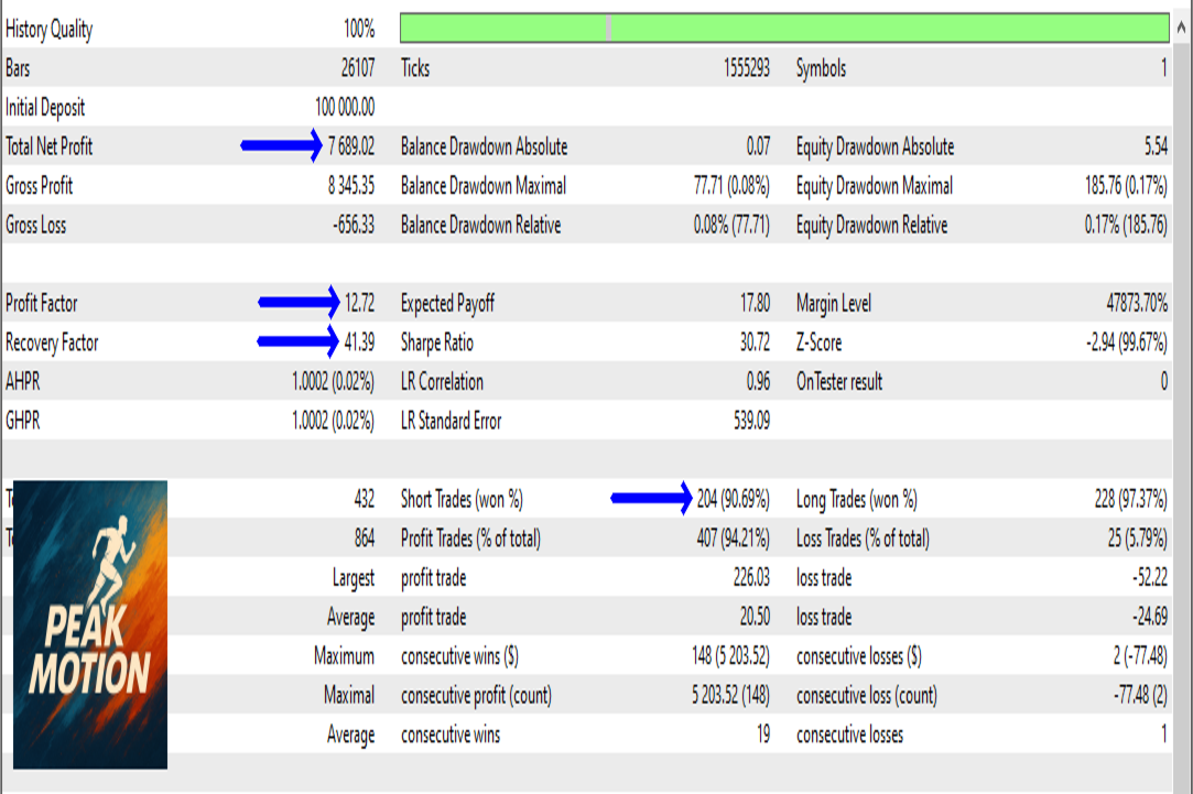 Ausgestattet mit ausgeklügelten Algorithmen passt sich Peak Motion sanft an Änderungen der Markttrends an und sorgt dafür, dass die Trades mit den aktuellen Marktentwicklungen übereinstimmen. Der EA nutzt eine Kombination aus gleitenden Durchschnitten und Momentumfiltern, um jeden Trade zu validieren und zuverlässige Signale bei gleichzeitiger Minimierung des Risikos zu liefern.