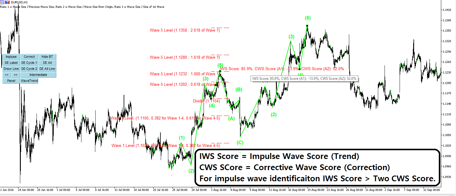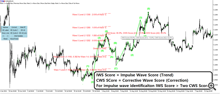 When you identify impulse Wave (trend), Impulse Wave Structural Score must be greater than Corrective Wave Structural Score. Or At least the Implulse Wave Structural Score must not be marginally smaller than Corrective Wave Structural Score assuming Impluse Wave Structural Score is greather than 80%.
