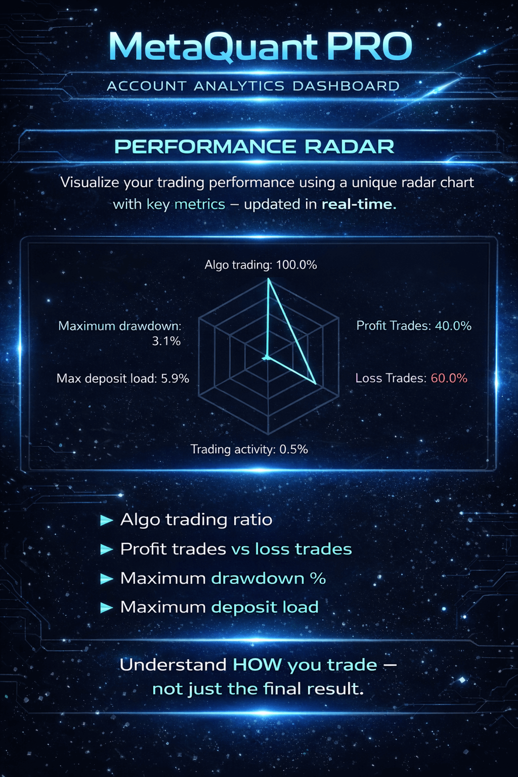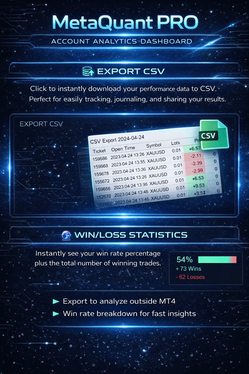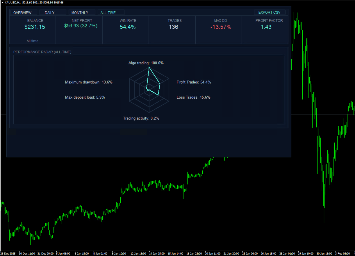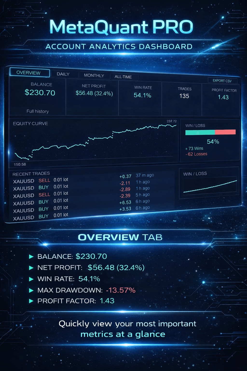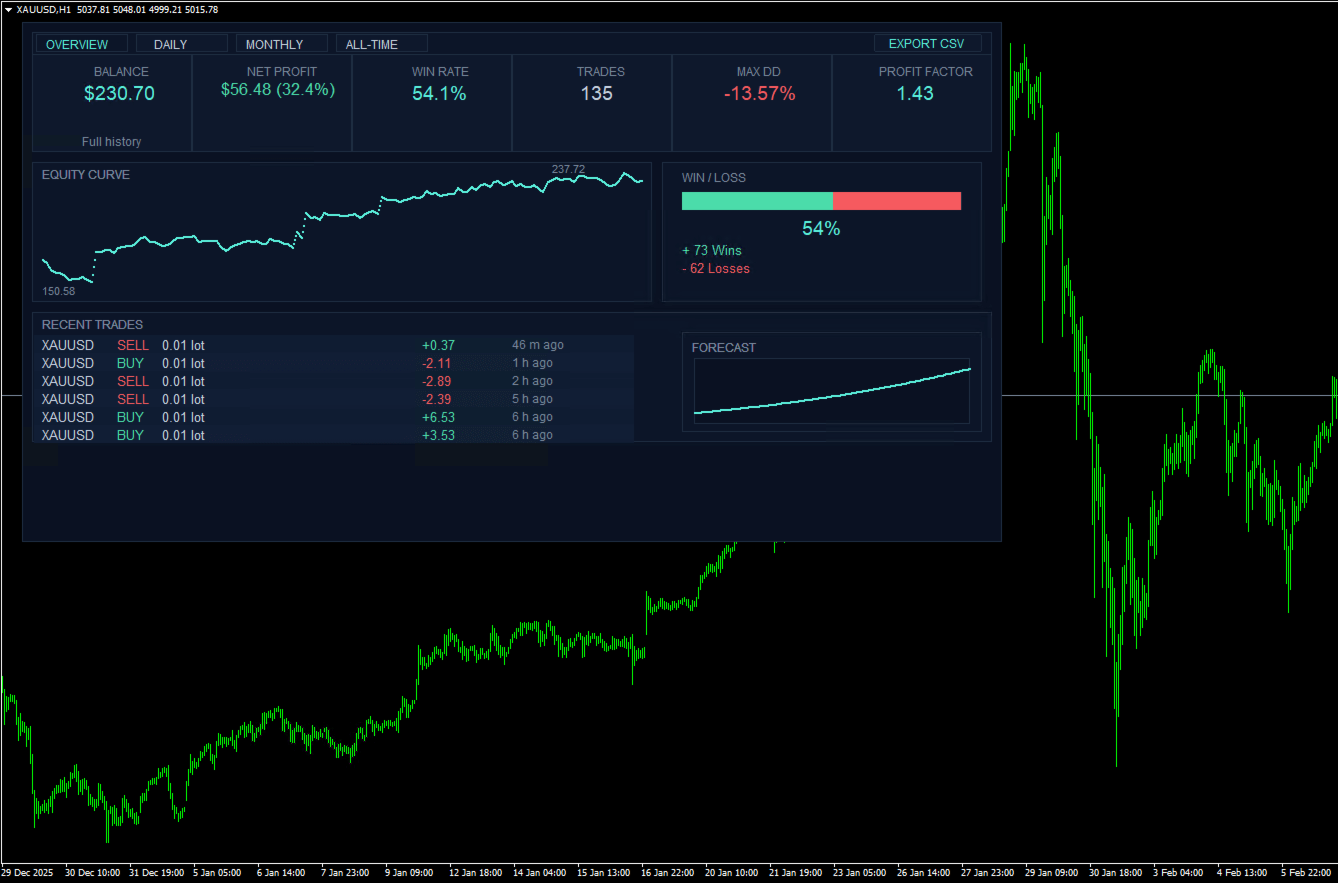 MetaQuant PRO ist ein professionelles Kontoanalyse-Dashboard für MetaTrader 4, das Händlern einen klaren, visuellen und datengesteuerten Überblick über ihre Handelsperformance direkt in MT4 bietet.