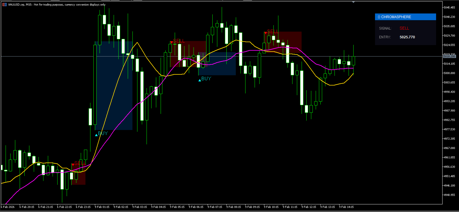 CHROMASPHERE ist ein von Bob's Channel entwickelter hochpräziser technischer Indikator für MetaTrader 5 (MQL5). Er kombiniert eine spezielle SMA-Crossover-Strategie mit einer dynamischen Erkennung von Unterstützungs- und Widerstandszonen (S/R), um eine klare, professionelle Handelsumgebung zu schaffen. Die Kernphilosophie dieses Tools ist visuelle Klarheit und Signalintegrität, um sicherzustellen, dass Händler sich auf die Preisaktion konzentrieren können, ohne durch "nachmalende" Indikatoren abgelenkt zu werden.