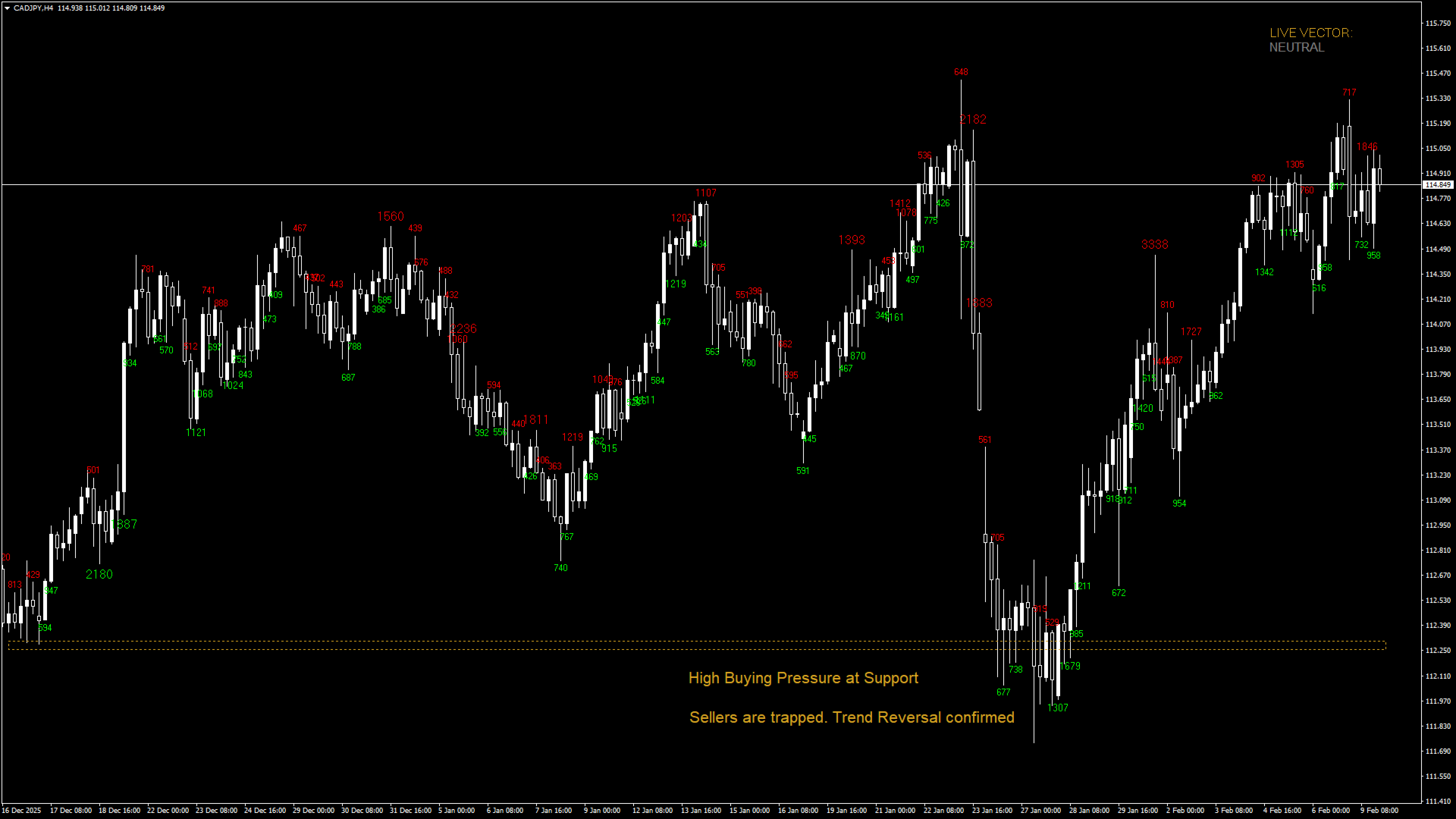 *Live-Vektor-Panel: Ein Echtzeit-Dashboard, das den aktuellen Marktzustand anzeigt (neutraler, bullischer oder bärischer Druck).