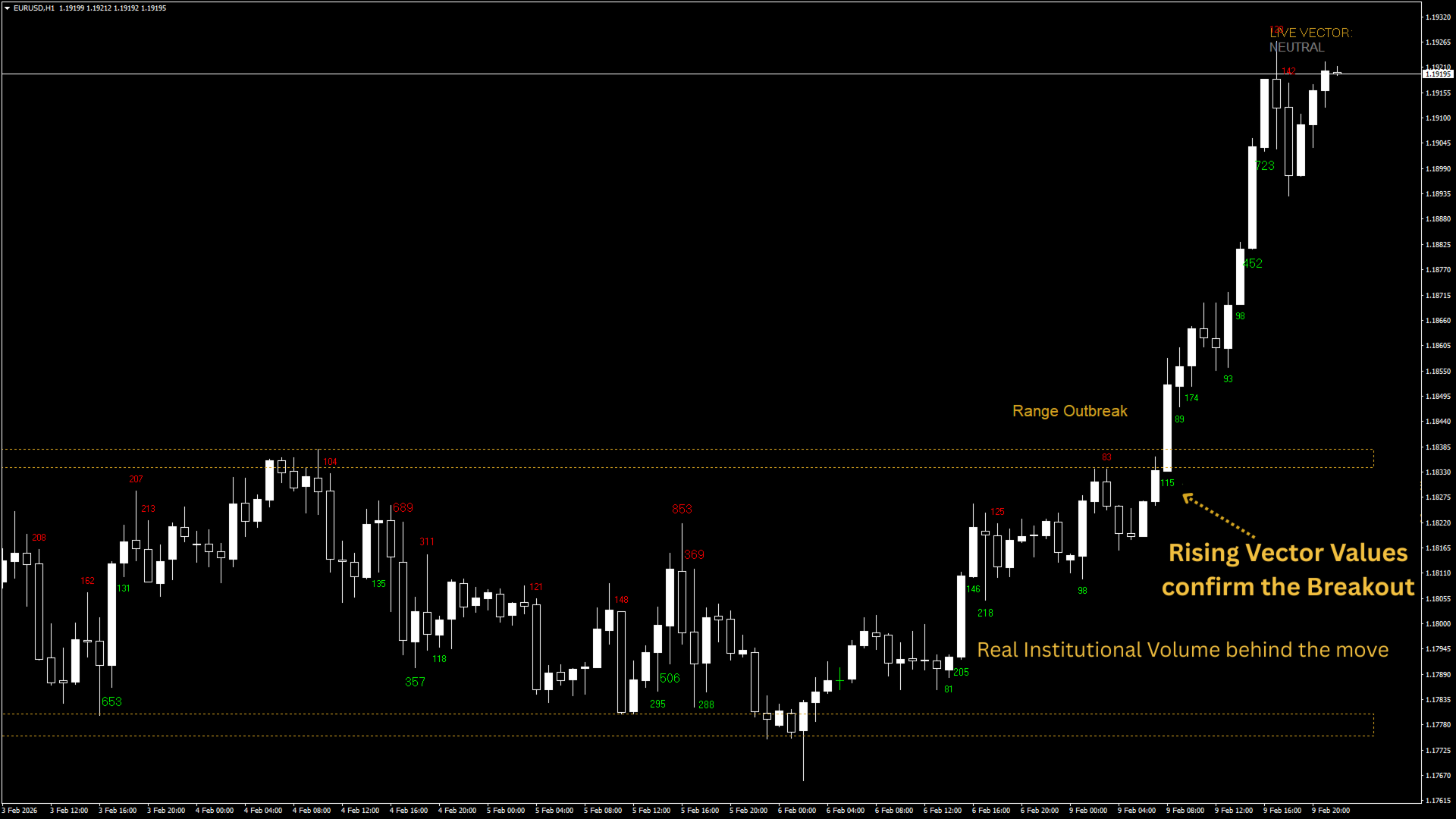 Der Indikator ordnet jeder Kerze einen numerischen "Vektorwert" zu. Dieser Wert wird von einem Algorithmus abgeleitet, der den Schlusskurs relativ zur High/Low-Range gegen die Volumenintensität abwägt.