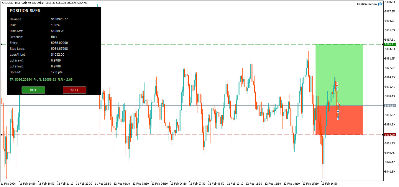 Ein-Klick-Ausführung: Eröffnen Sie sofort Kauf- oder Verkaufstransaktionen mit automatisch berechneter Losgröße, SL und TP.