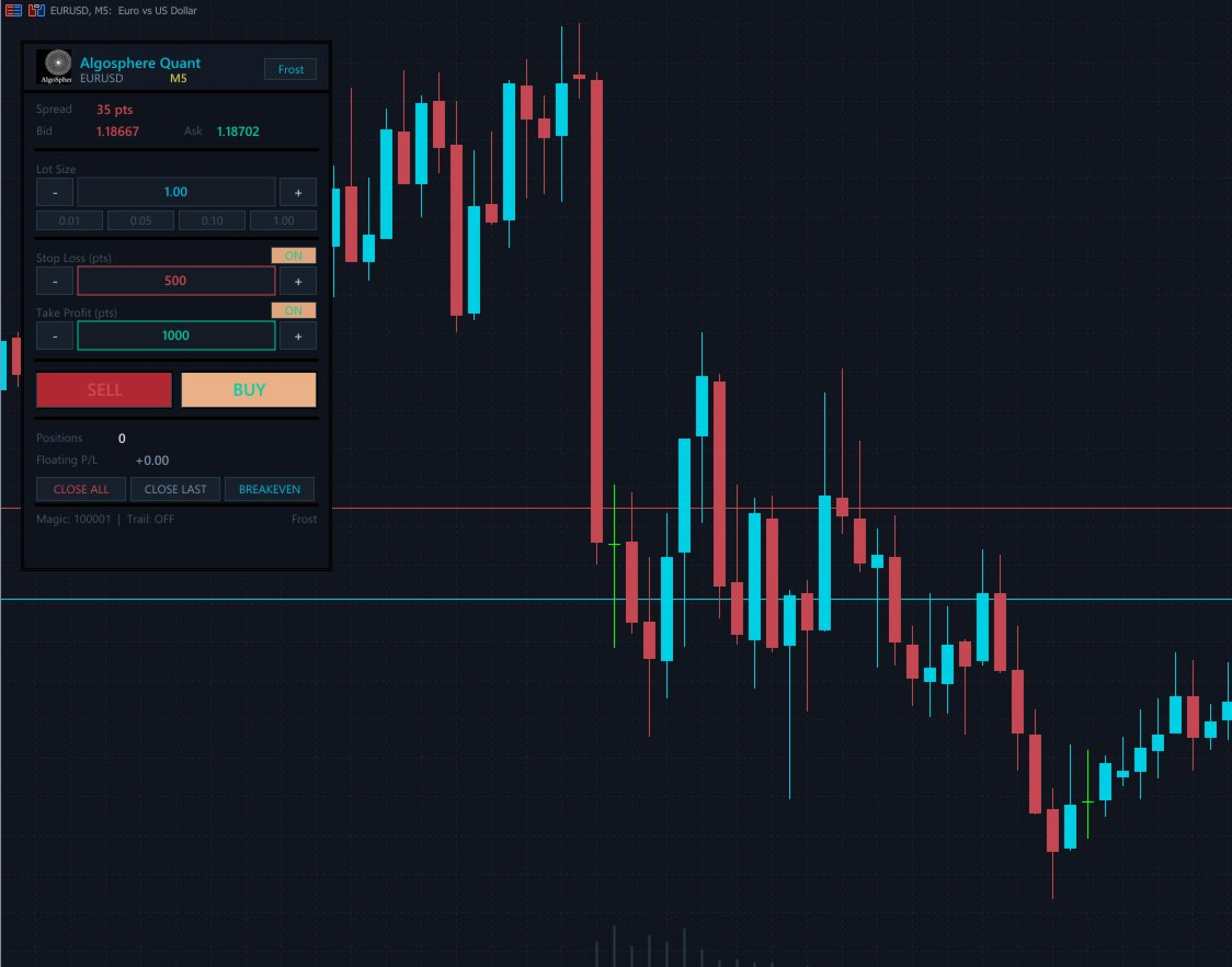 Algosphere Terminal ist ein professionelles One-Click-Trading-Panel fuer MetaTrader 5. Fuehren Sie BUY- und SELL-Orders sofort mit vordefiniertem Stop Loss und Take Profit in Punkten aus. Funktionen umfassen einstellbare Lotgroessen mit Schnellvoreinstellungen, Live-Spread-Ueberwachung mit Farbwarnungen, Trailing Stop mit konfigurierbarer Aktivierung, Breakeven-Funktion und Positionsmanagement-Tools. Waehlen Sie aus vier eleganten Themes: Obsidian, Emerald, Frost und Neon. Einstellungen werden zwischen Sitzungen gespeichert. Funktioniert mit Forex, Indizes und CFDs.