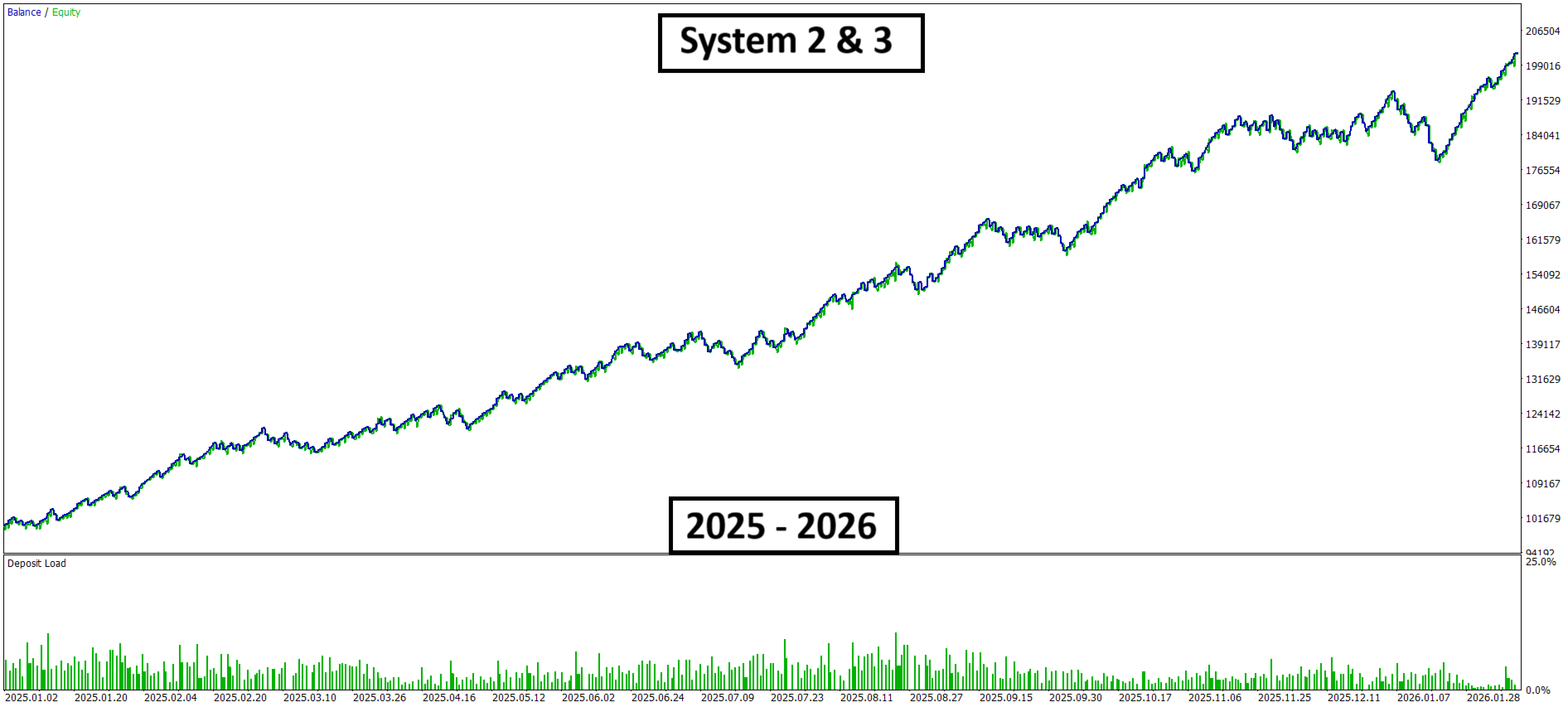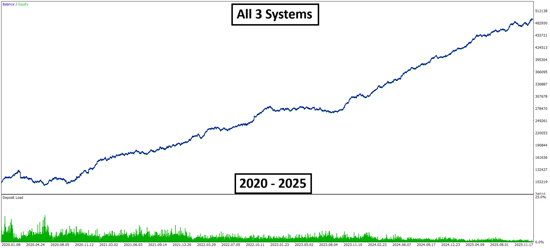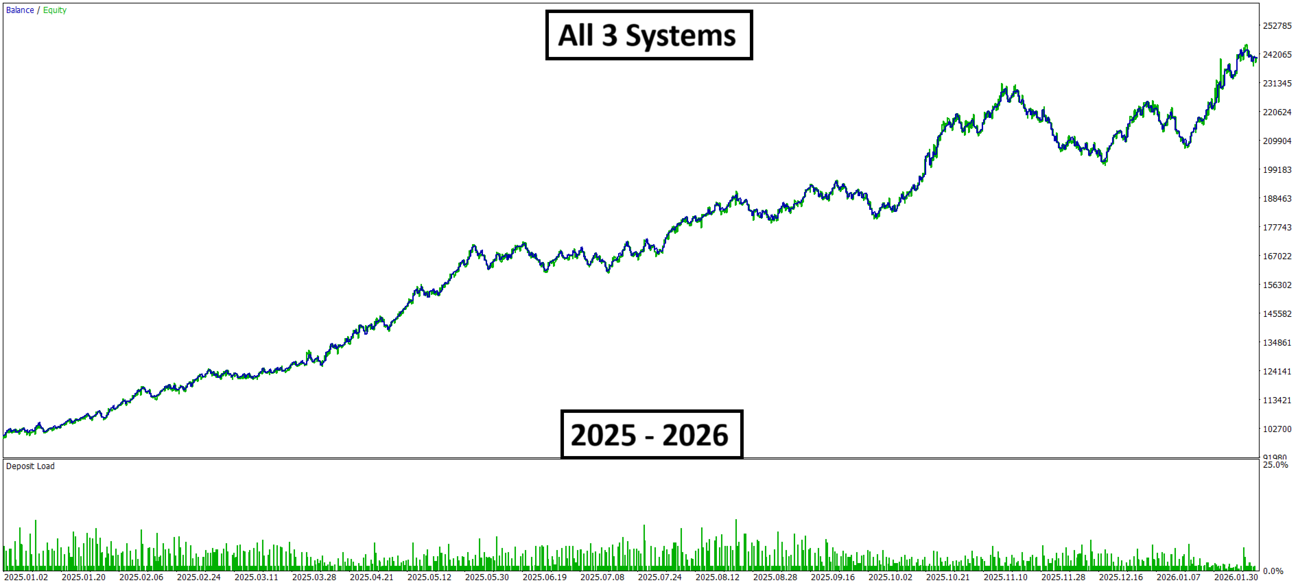 Der Expert Advisor (EA) darf nicht an mehrere Charts angehängt werden. Eine Instanz verwaltet alle drei Systeme.