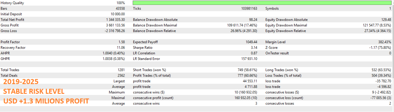 Multiplikatorfaktoren passen das Risiko in Echtzeit an die Marktbedingungen an. All dies mit konfigurierbaren maximalen Risikogrenzen und Schutz vor Verlustserien.