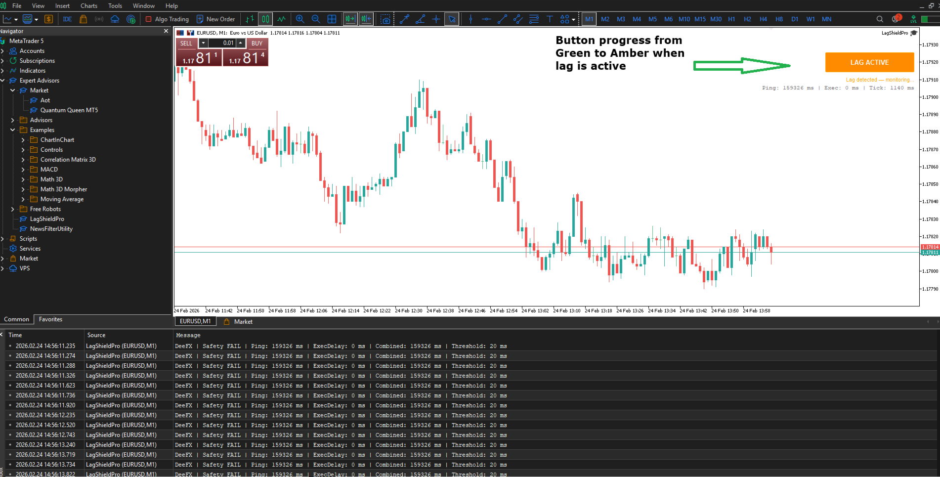 LagShield Pro ist ein hochpräziser Ausführungs-Validator, der für die moderne Prop-Firm-Umgebung entwickelt wurde. Während sich die meisten Händler auf Einstiegssignale konzentrieren, achten professionelle Händler auf die Integrität der Ausführungsumgebung. Dieses Dienstprogramm fungiert als spezielle Firewall zwischen Ihren Handelsabsichten und dem Broker-Server. Durch die Überwachung von Inter-Tick-Deltas und Netzwerk-Ping in Echtzeit stellt LagShield Pro sicher, dass Sie niemals einen Handel eingehen, wenn der Markt "eingefroren" ist, oder während eines hohen Slippage-Ereignisses aussteigen.