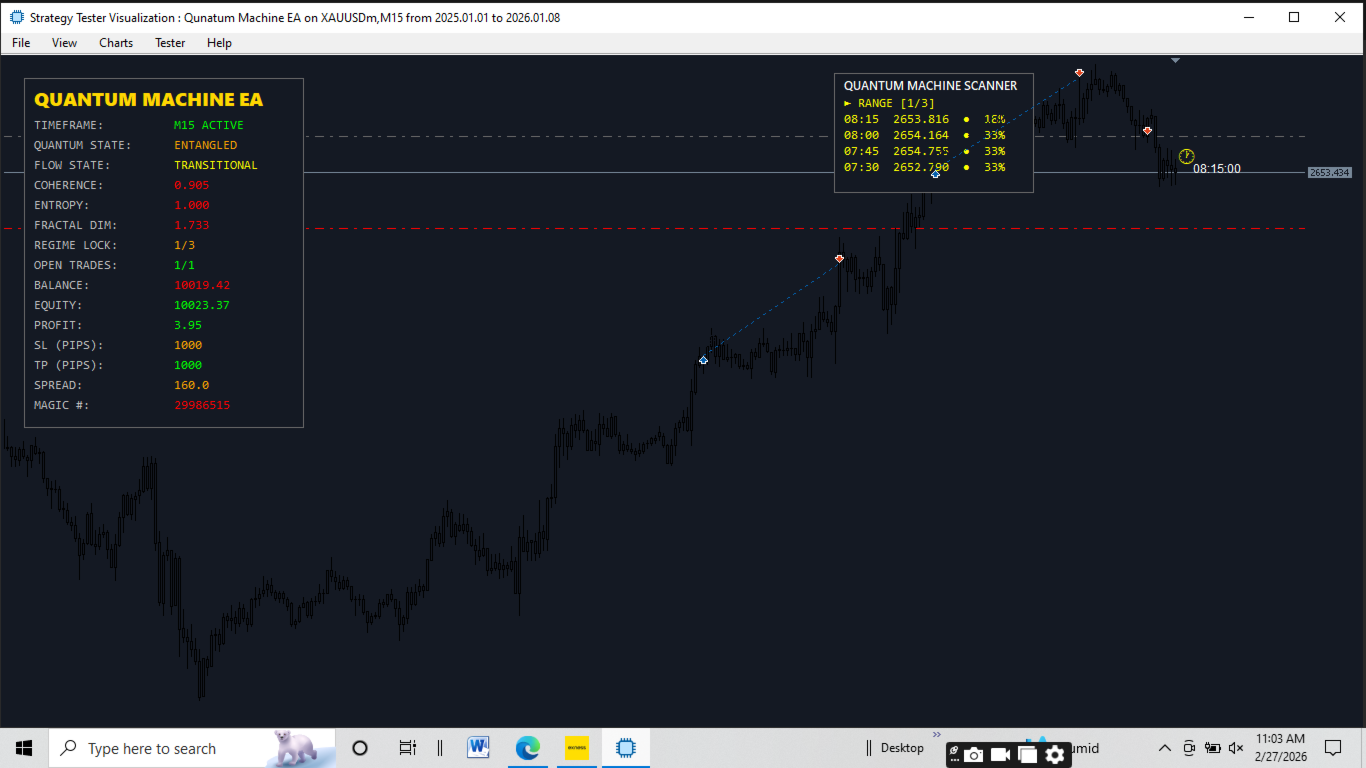 Welcome to the QUANTUM MACHINE EA - a revolutionary trading system engineered specifically for GOLD (XAUUSD) on the M15 timeframe. Unlike conventional Expert Advisors that rely on lagging and repainting indicators, Quantum Machine employs advanced market microstructure analysis and quantum state physics to read the actual DNA of price movement.