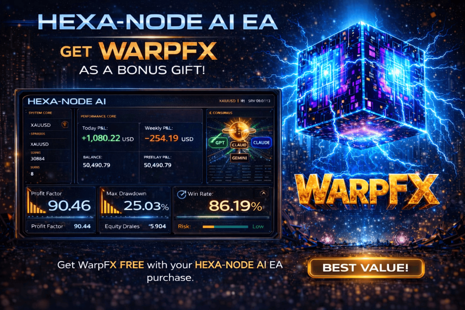 BONUS: Beim Kauf von Hexa-Node AI erhalten Sie den WarpFX Expert Advisor als Geschenk. Schreiben Sie mir nach der Zahlung eine private Nachricht, um Ihre Kopie zu erhalten.