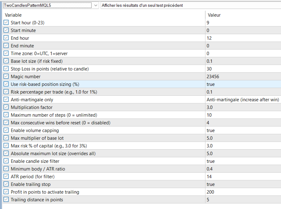 *Ein einfaches und robustes Handelssystem basierend auf einem Zwei-Kerzen-Muster, optimiert für EURUSD auf M15, mit Anti-Martingale-Risikomanagement und Trailing Stop.