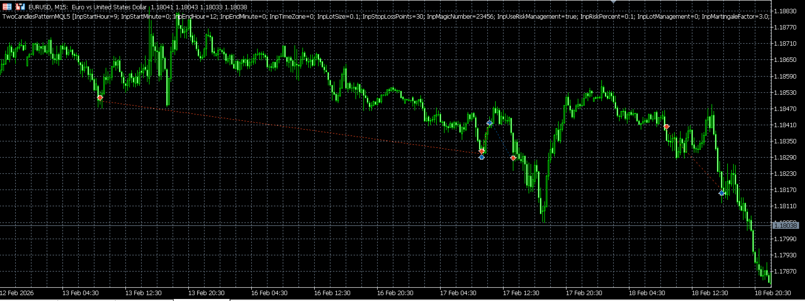 Laden Sie die Testversion herunter und testen Sie **TwoCandlesPattern** auf EURUSD M15 im Strategy Tester noch heute.