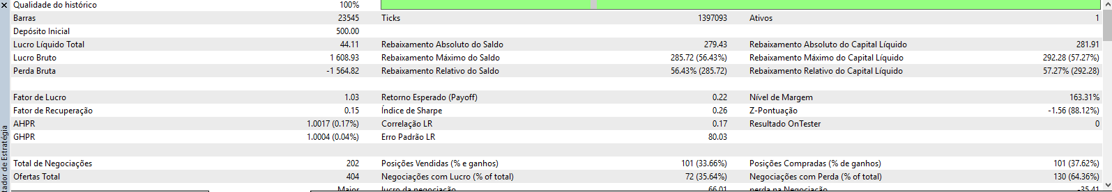 malheureusement, je ne possède pas le fichier .set pour la configuration du robot. Ici, le backtest a fonctionné normalement, je le laisse en pièce jointe. Mon MetaTrader est en portugais, mais vous pouvez traduire l'image en français avec Google Traduction.