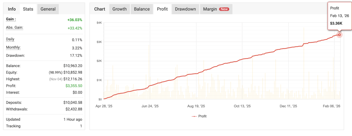 Die Ein- und Ausstiegslogik ist vollständig in den Algorithmus integriert: Der Roboter erfordert keine komplexe Optimierung oder überfrachtet Sie mit Einstellungen. Sie legen die grundlegenden Parameter für das Risikomanagement fest (Losgröße, Drawdown-Limits und Schutzmodi), und der Advisor trifft dann automatisch Entscheidungen: Er eröffnet Trades, wenn sie benötigt werden, und hält sie, wenn die Bedingungen nicht stimmen, was für die Disziplin und den Kapitalschutz in volatilen Phasen entscheidend ist.