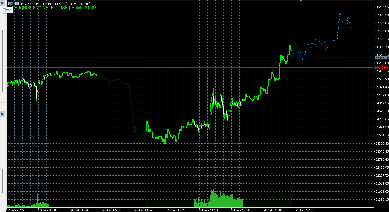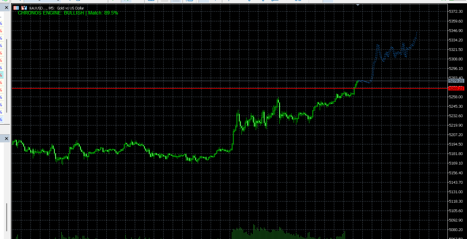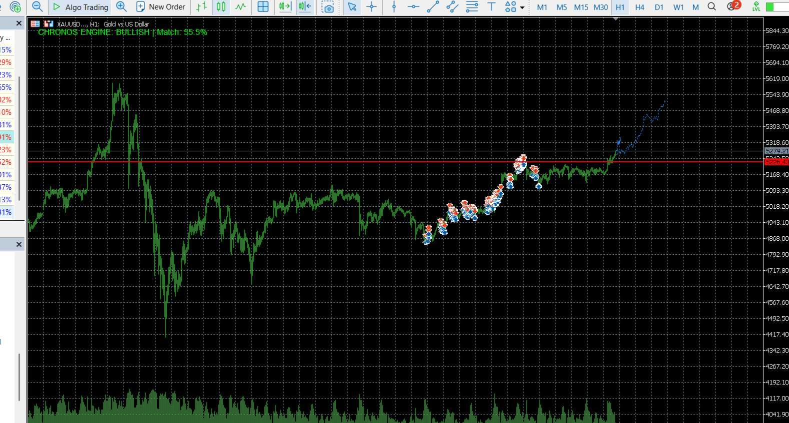 Armaturenbrett: Zeigt die "CHRONOS ENGINE: BULLISH/BEARISH" Richtung und den "Match %" Konfidenzwert an.