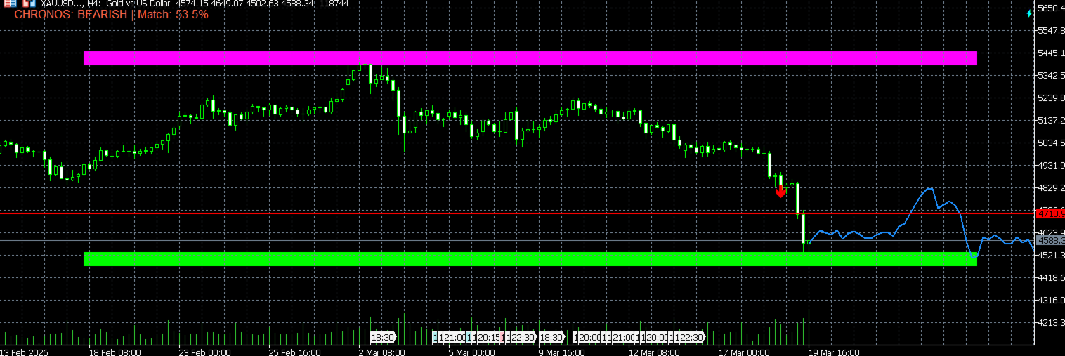 Armaturenbrett: Zeigt die "CHRONOS ENGINE: BULLISH/BEARISH"-Richtung und den "Match %"-Konfidenzwert an.