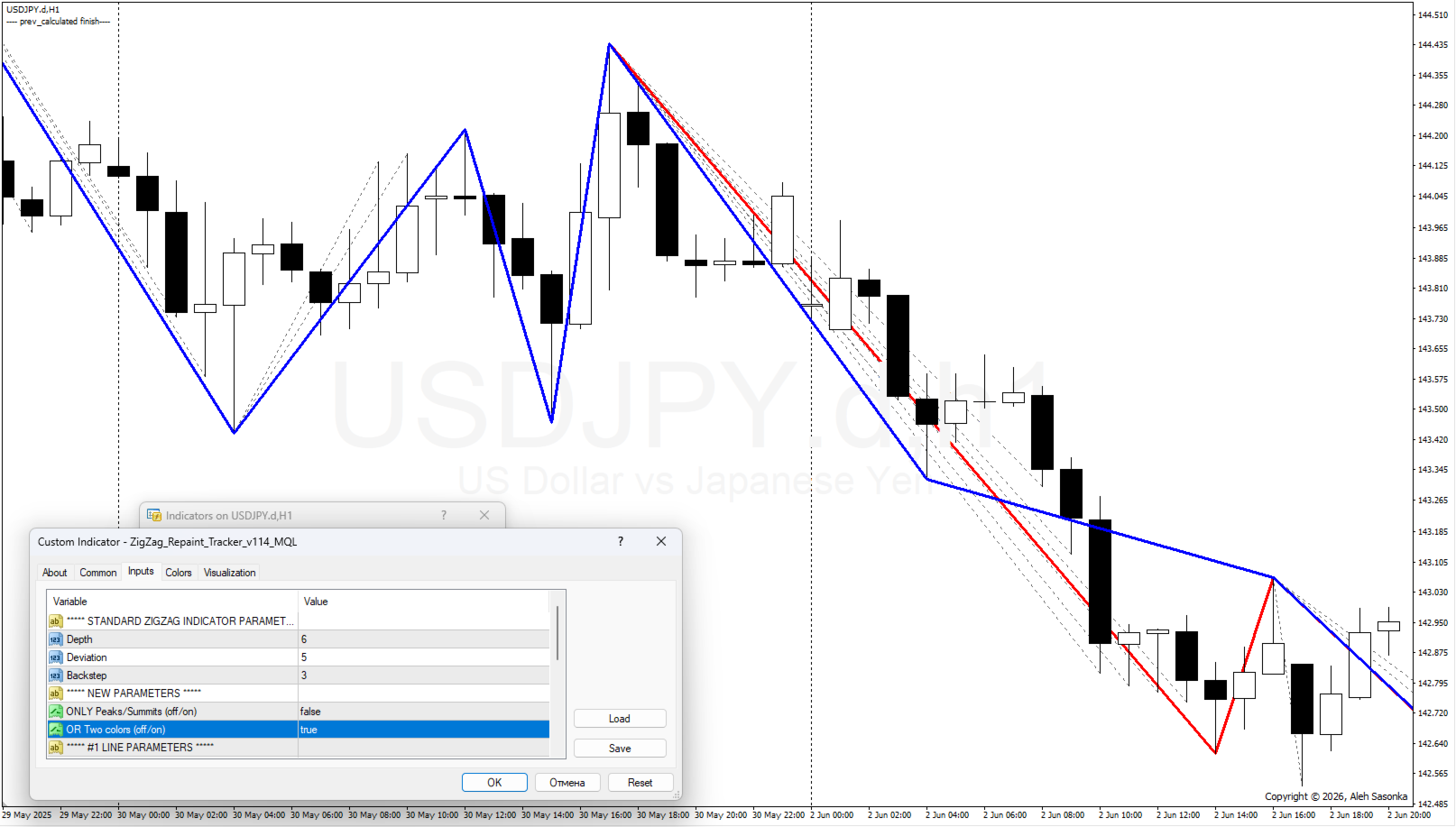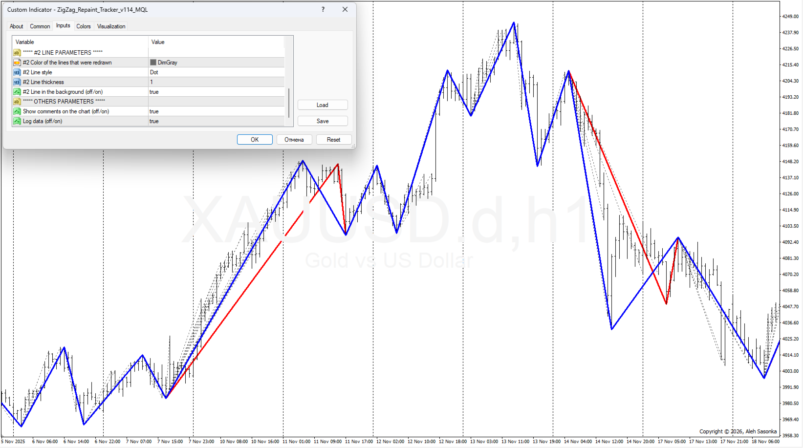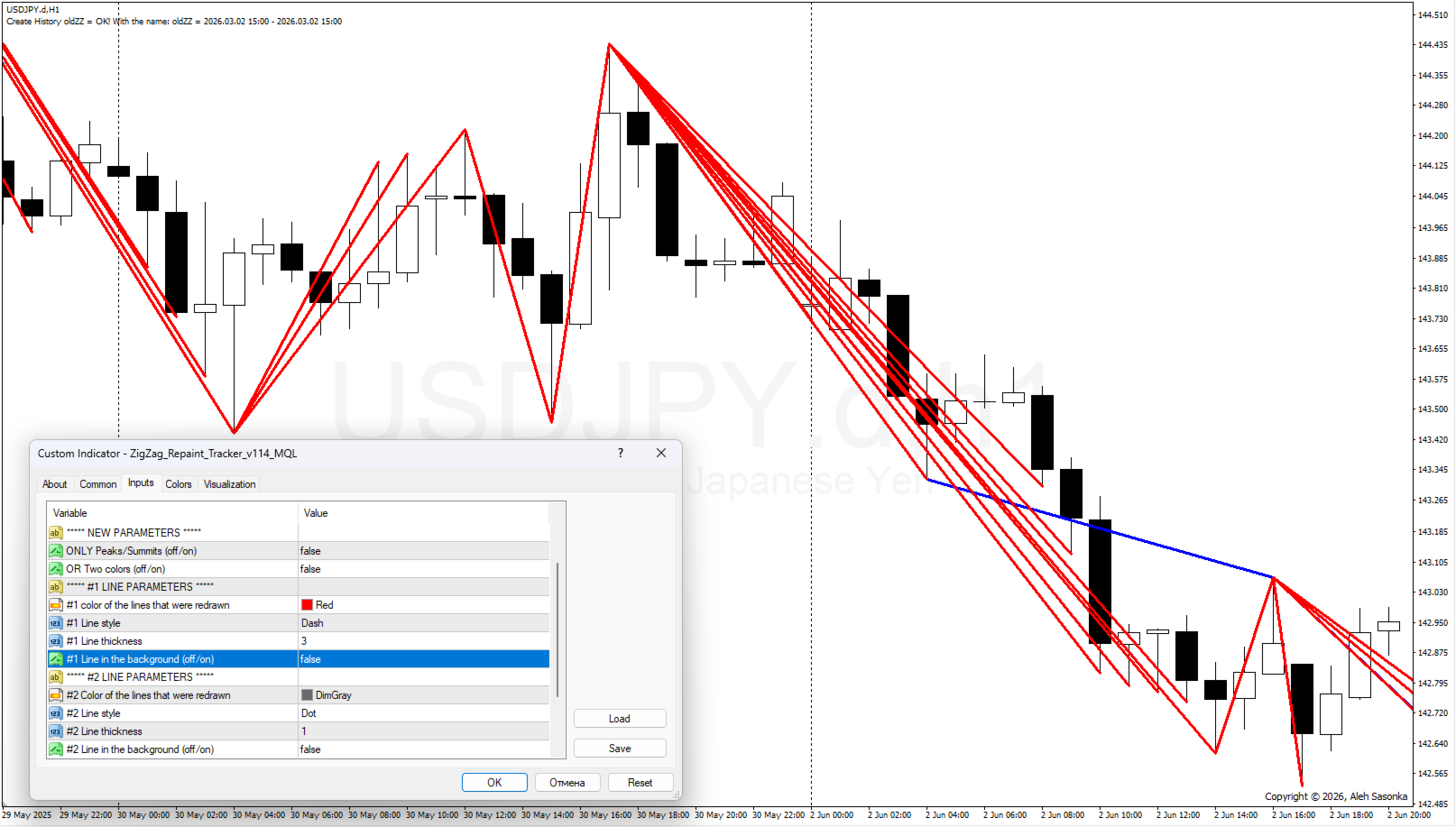 - ONLY_Peaks/Summits = OFF, OR_Two_colors = OFF, #1 Line in the background = OFF, #2 Line in the background = OFF. In dieser Version sehen wir alle rot gezeichneten Linien im Vordergrund. Und an einigen Stellen schaut die blaue Linie des Standard-ZIGZAGs durch - die Stelle, die beim Erscheinen neuer Zecken nicht verändert wurde. *Siehe Abbildung 4.