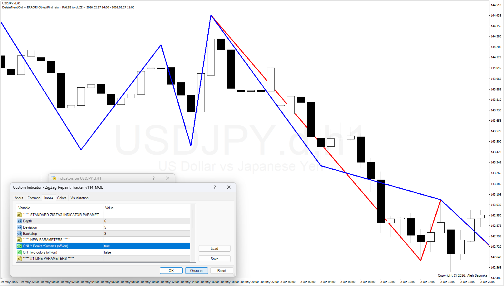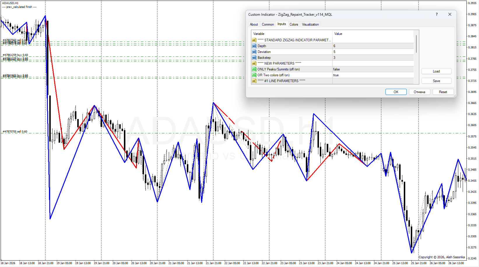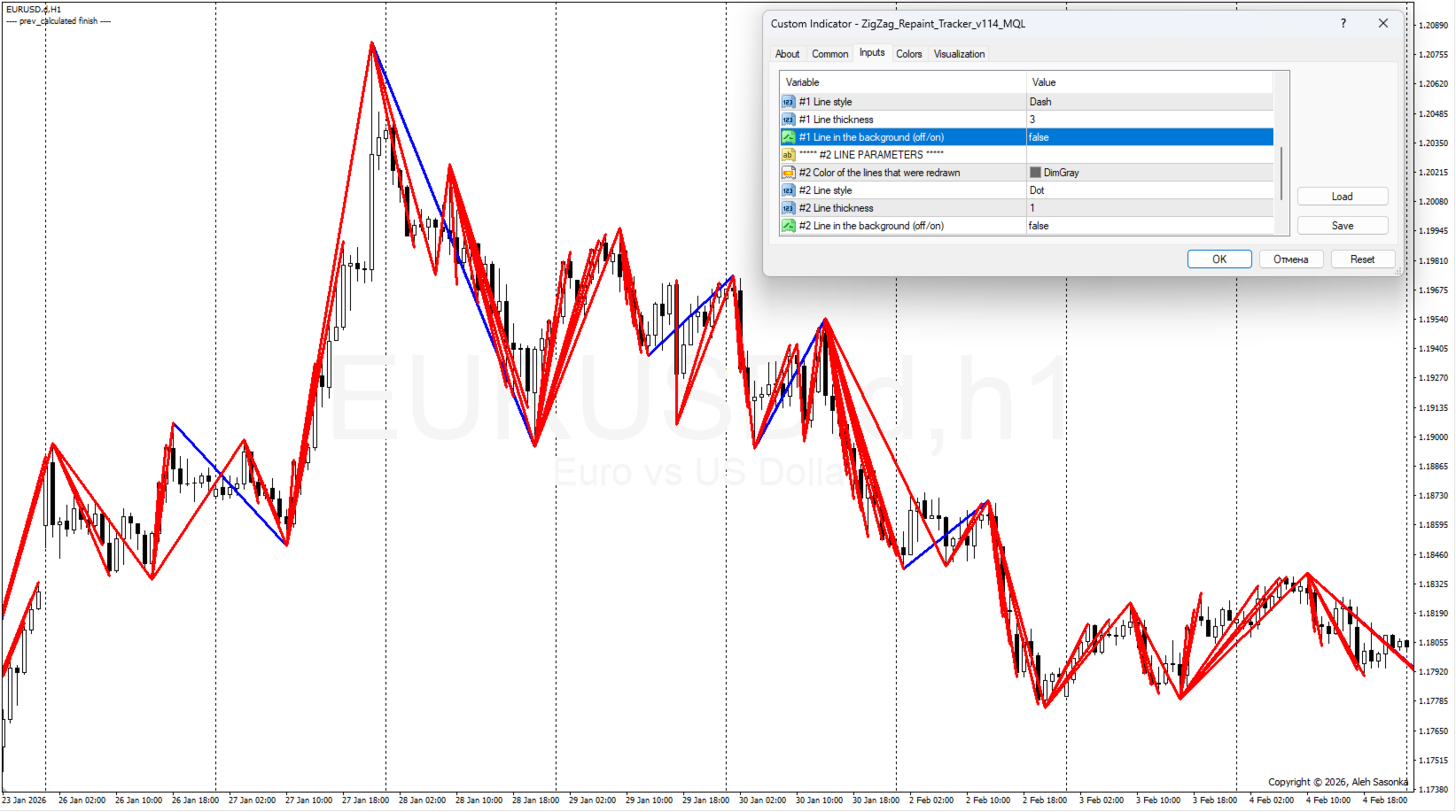 - ONLY_Peaks/Summits = OFF, OR_Two_colors = OFF, #1 Line in the background = OFF, #2 Line in the background = OFF. In dieser Version sehen wir alle rot gezeichneten Linien im Vordergrund. Und an einigen Stellen schaut die blaue Linie des Standard-ZIGZAGs durch - die Stelle, die beim Erscheinen neuer Zecken nicht verändert wurde. *Siehe Abbildung 4.