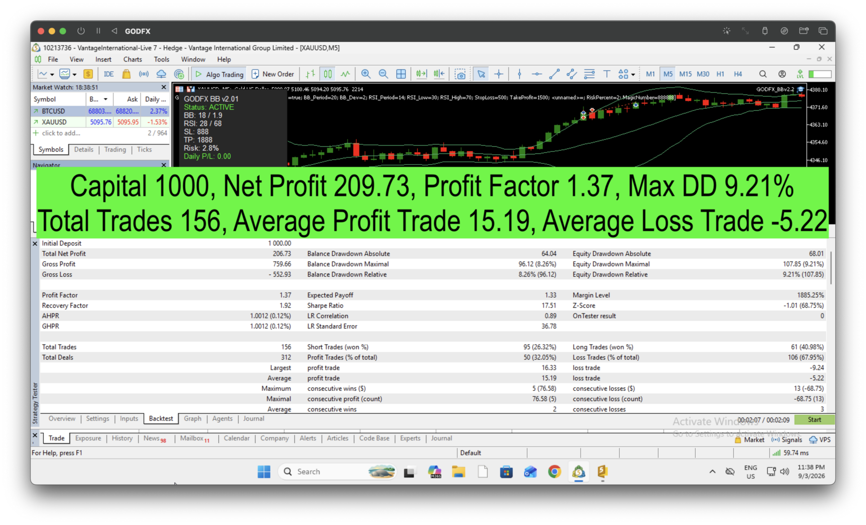GODFX BB ist eine hochkarätige algorithmische Workstation, die für professionelle Trader entwickelt wurde, die Präzision über Impuls verlangen. Während Einzelhändler im Marktrauschen untergehen, liest diese Maschine die Volatilität mit institutioneller Klarheit - sie identifiziert genau den Moment, in dem die Preisstruktur überdreht und führt Einstiege zum Zeitpunkt der maximalen Erschöpfung aus.