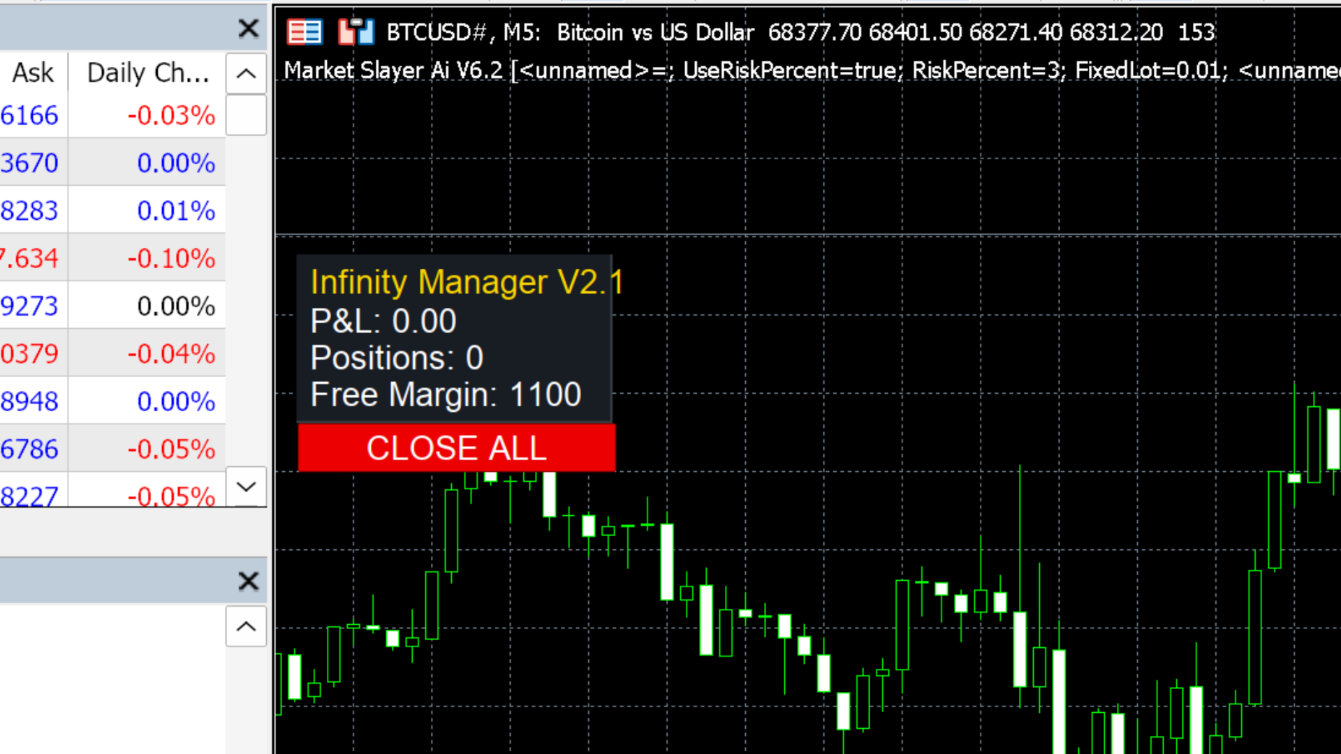 Infinity Manager ist ein leistungsstarker und zugleich schlanker Trade-Management-Expert Advisor für MetaTrader 5. Er wurde entwickelt, um Tradern durch ein klares, modernes On-Chart-Dashboard die vollständige Kontrolle über ihre offenen Positionen zu ermöglichen.