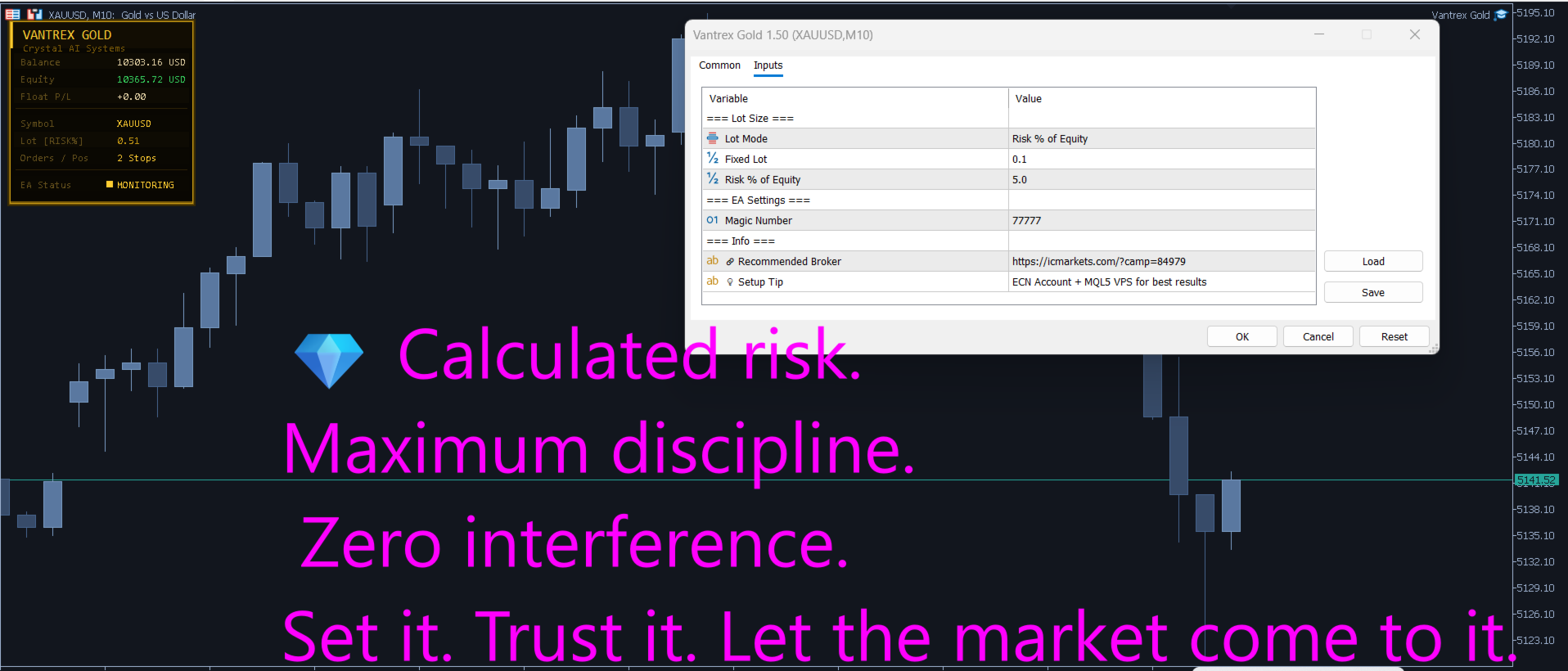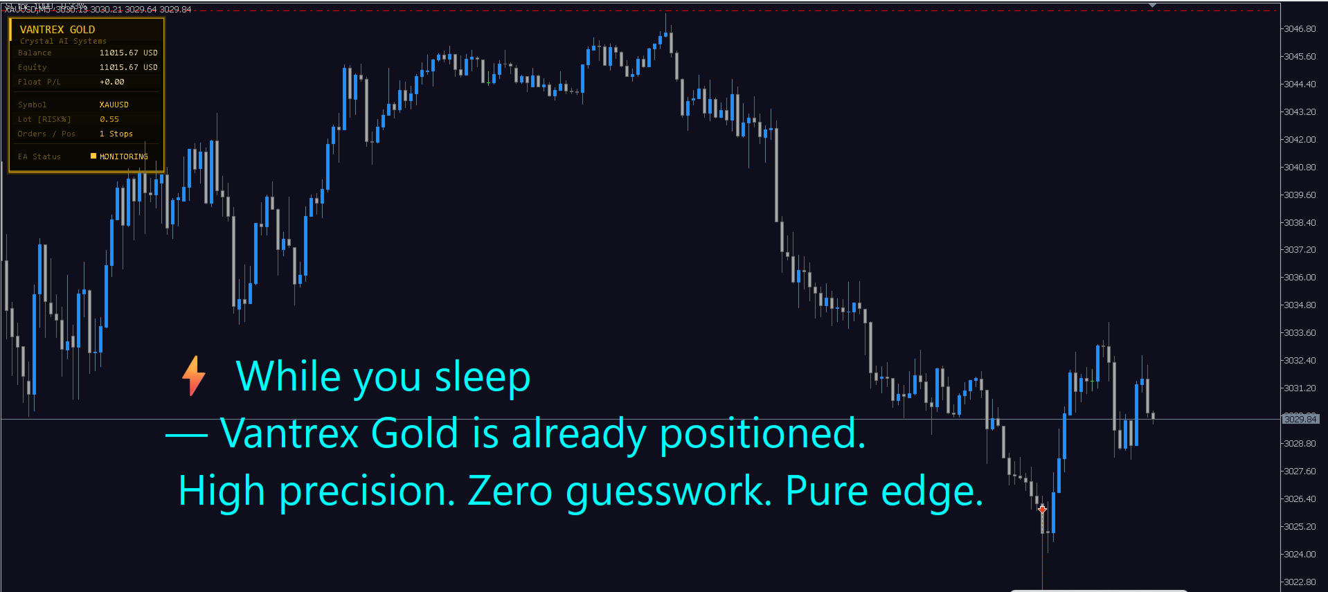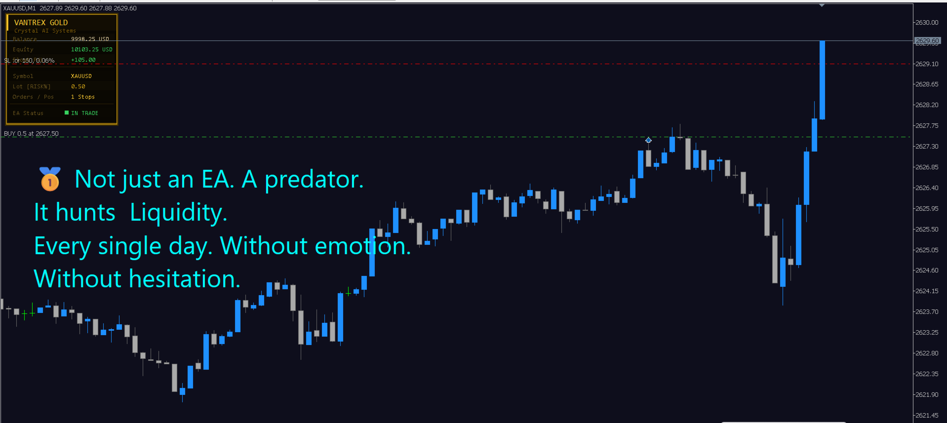 Vantrex Gold ist ein vollautomatischer Expert Advisor, der ausschließlich für XAUUSD auf MetaTrader 5 entwickelt wurde. Hängen Sie ihn an den Chart an, konfigurieren Sie zwei Eingaben, und das System läuft von selbst. Keine Strategiekenntnisse erforderlich. Keine manuellen Entscheidungen. Keine tägliche Verwaltung.