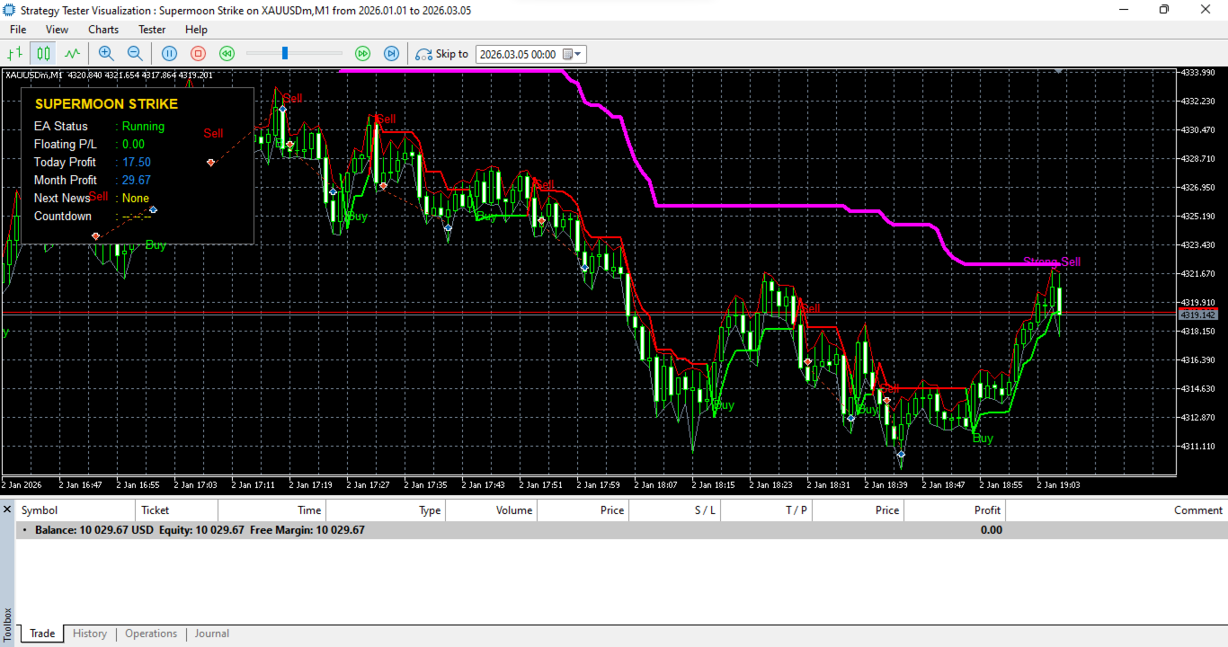 Willkommen in der Ära von Supermoon Strike. Dies ist nicht nur ein weiterer Handelsroboter, sondern eine hochpräzise Maschine, die entwickelt wurde, um explosive Marktimpulse mit tödlicher Genauigkeit zu erfassen. Getreu seinem Namen konzentriert sich dieser EA auf eine scharfe Ausführung und Gewinnziele, die in die Höhe schießen, während er gleichzeitig durch ein Risikomanagement auf Elite-Niveau geerdet bleibt.