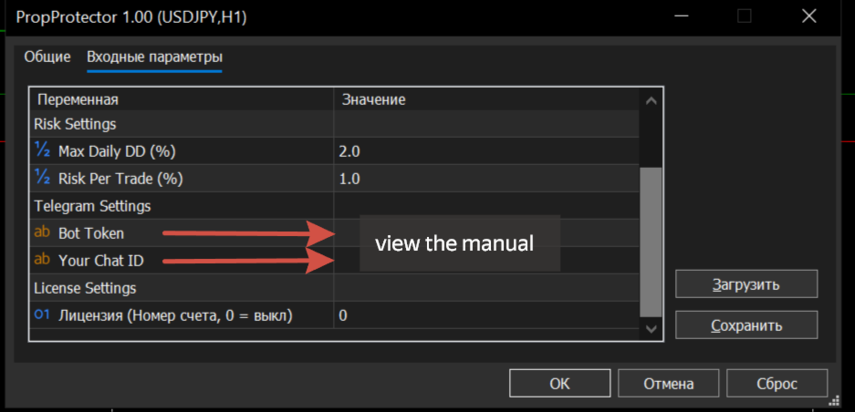 Geben Sie Ihr Bot-Token und Ihre Chat-ID in die Eingabeparameter des Dienstprogramms ein.