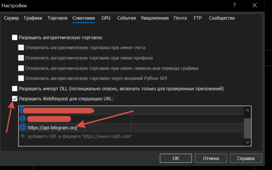 Für Telegram-Benachrichtigungen gehen Sie zuTools -> Options -> Expert Advisors, aktivieren Sie "Allow WebRequest for listed URL" und fügen Siehttps://api.telegram.org hinzu.