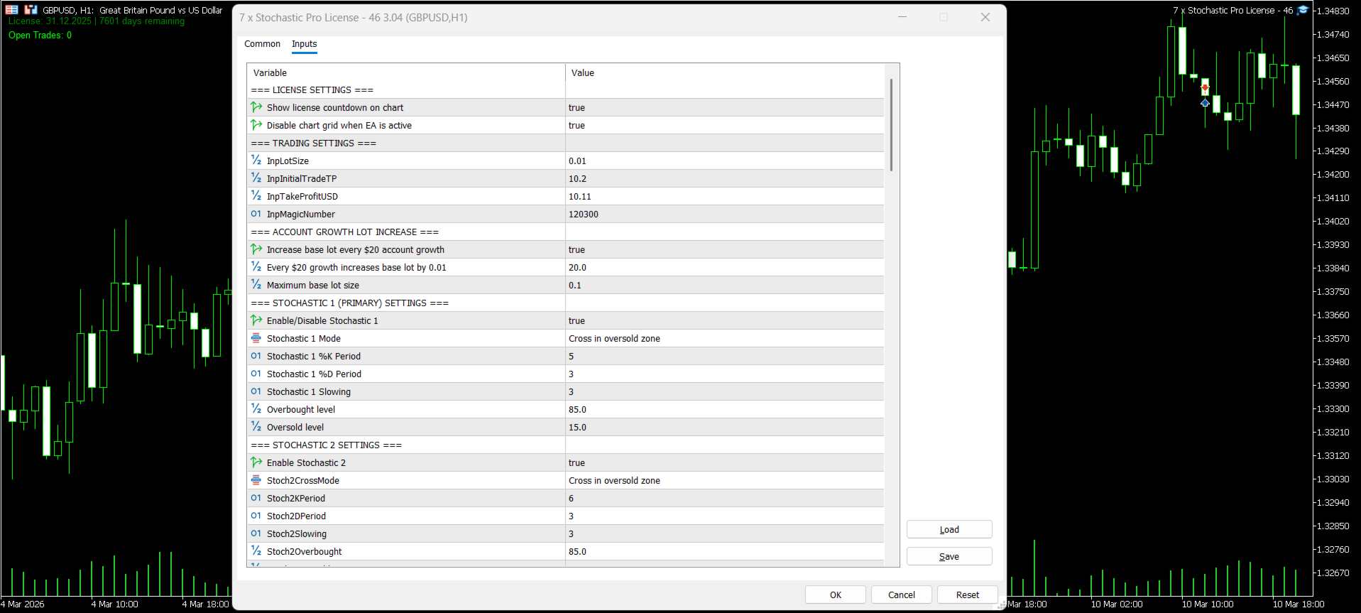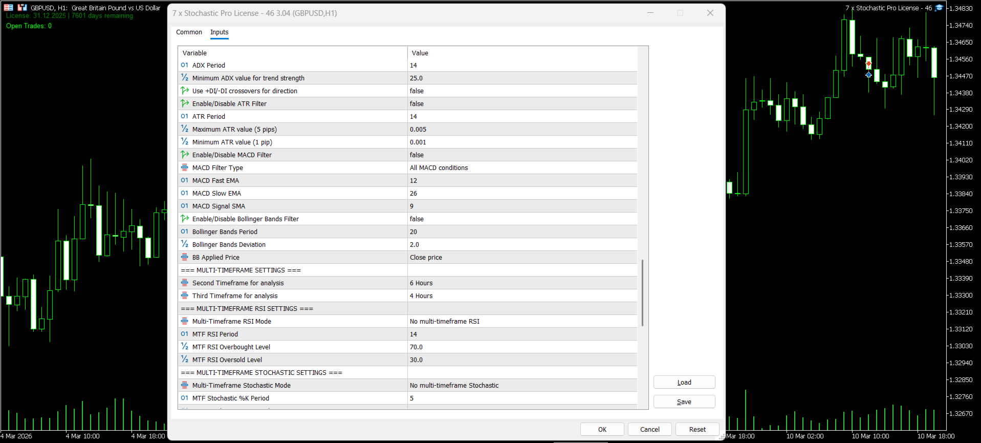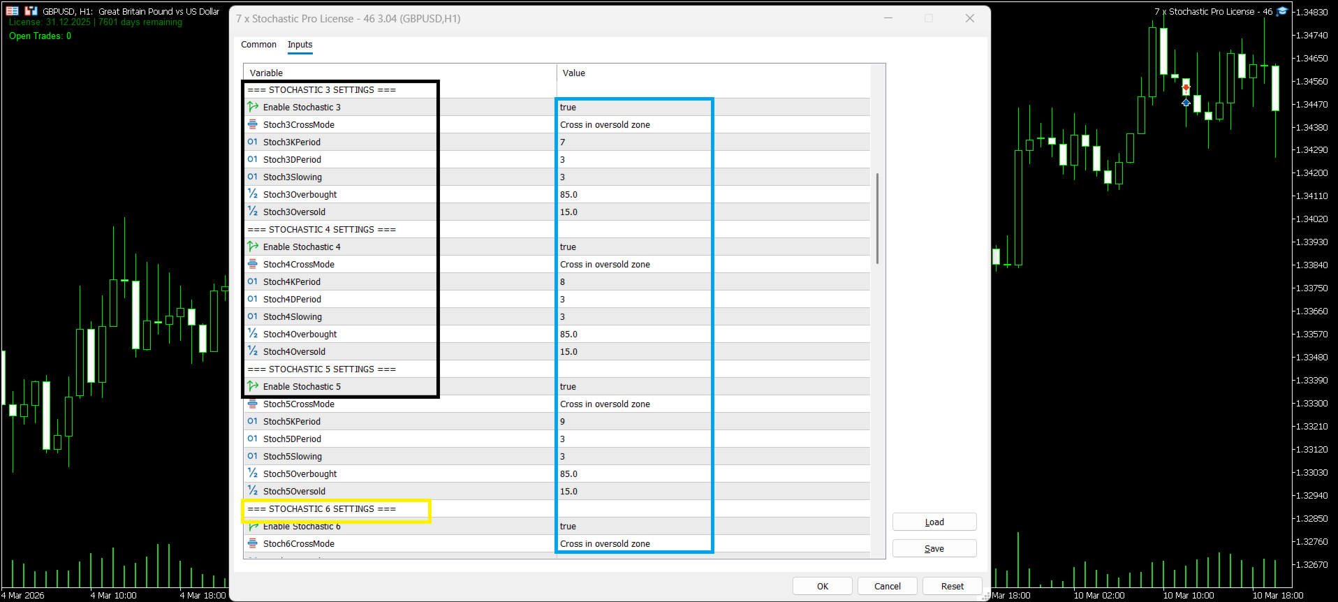 Jede der sieben Stochastiken kann unabhängig ein- oder ausgeschaltet werden, so dass Händler die Strategie an die Marktbedingungen anpassen können, ohne die Logik zu sehr zu verkomplizieren. -