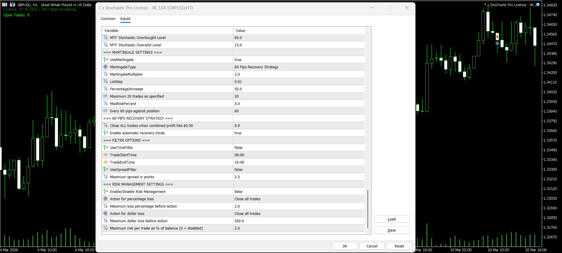 Dutzende von Eingabeparametern ermöglichen Händlern die Feinabstimmung jedes Aspekts, von stochastischen Perioden bis hin zu Martingal-Multiplikatoren, um ihrem Handelsstil und ihrer Risikotoleranz zu entsprechen. -