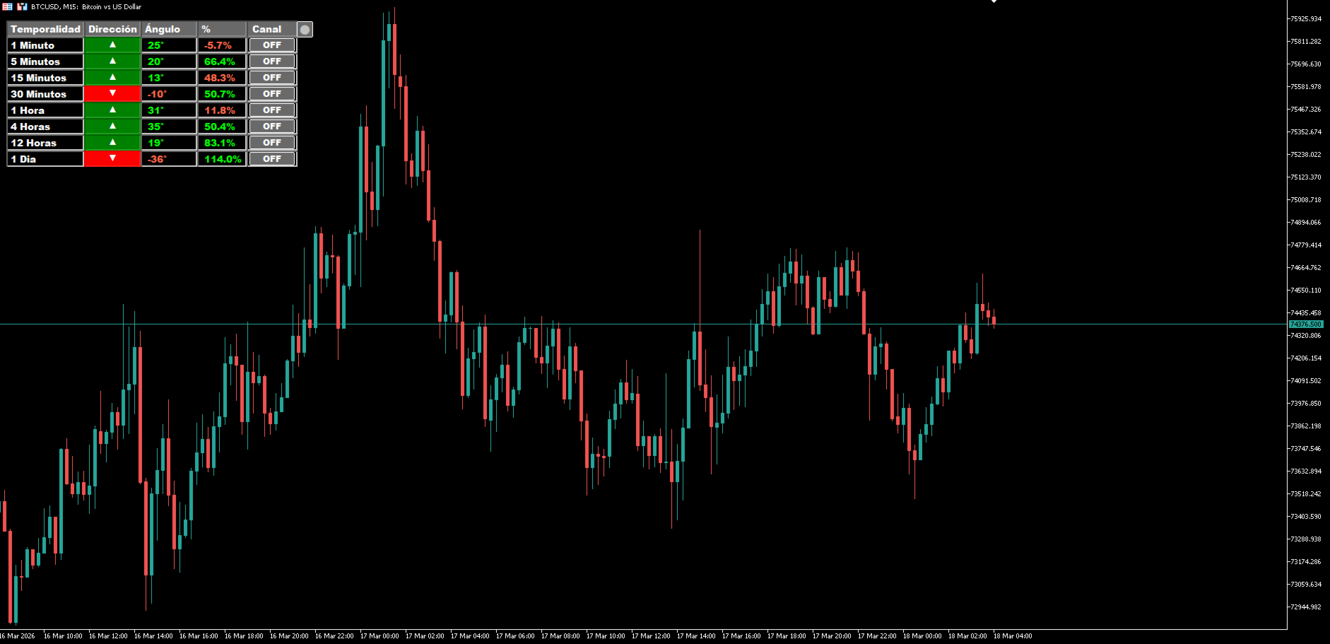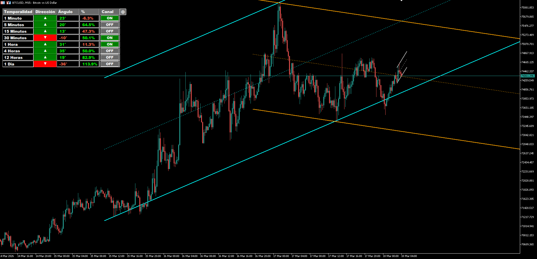 Anstatt den Händler zu zwingen, mehrere Kanäle gleichzeitig zu betrachten, organisiert dieser Indikator die wichtigsten Informationen in einem übersichtlichen und leicht zu lesenden Panel. Jeder Zeitrahmen ist auf drei wesentliche Elemente reduziert: Richtung, Winkel und Preisposition innerhalb des projizierten Kanals. Darüber hinaus enthält jede Zeile ein ON/OFF-Bedienelement, mit dem der Benutzer den Kanal für den jeweiligen Zeitrahmen direkt aus dem Panel heraus einzeichnen oder entfernen kann.