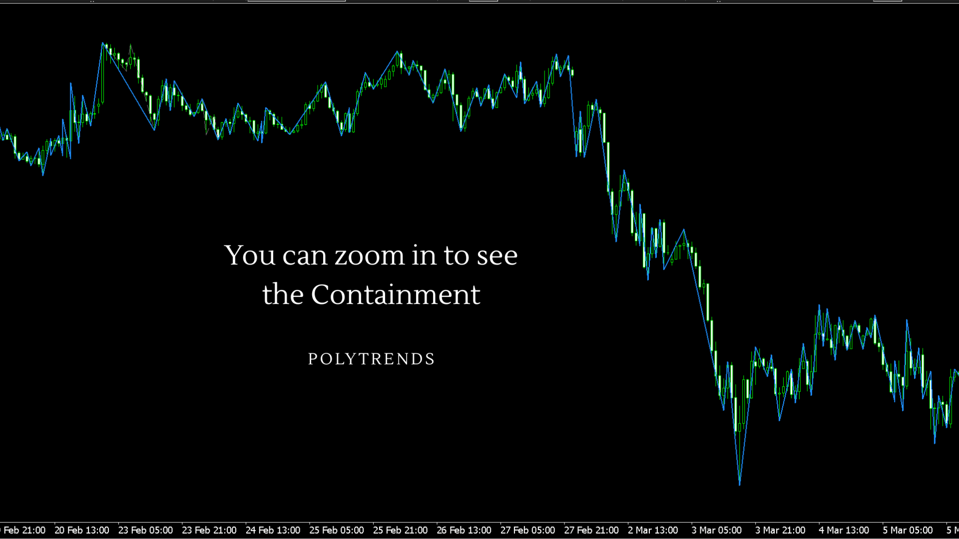 Das gestrichelte Zickzack (Show Containment mode) - Wenn diese Funktion aktiviert ist, zeigen die gestrichelten Linien die internen Wellen an, die der Kurs während der Entwicklung des Trends durchlaufen hat. Händler nutzen dies, um zu sehen, wie sich der Kurs innerhalb des Trends konsolidierte oder zurückzog, bevor er sich fortsetzte, was bei der Identifizierung von Einstiegspunkten während Rücksetzern hilft.