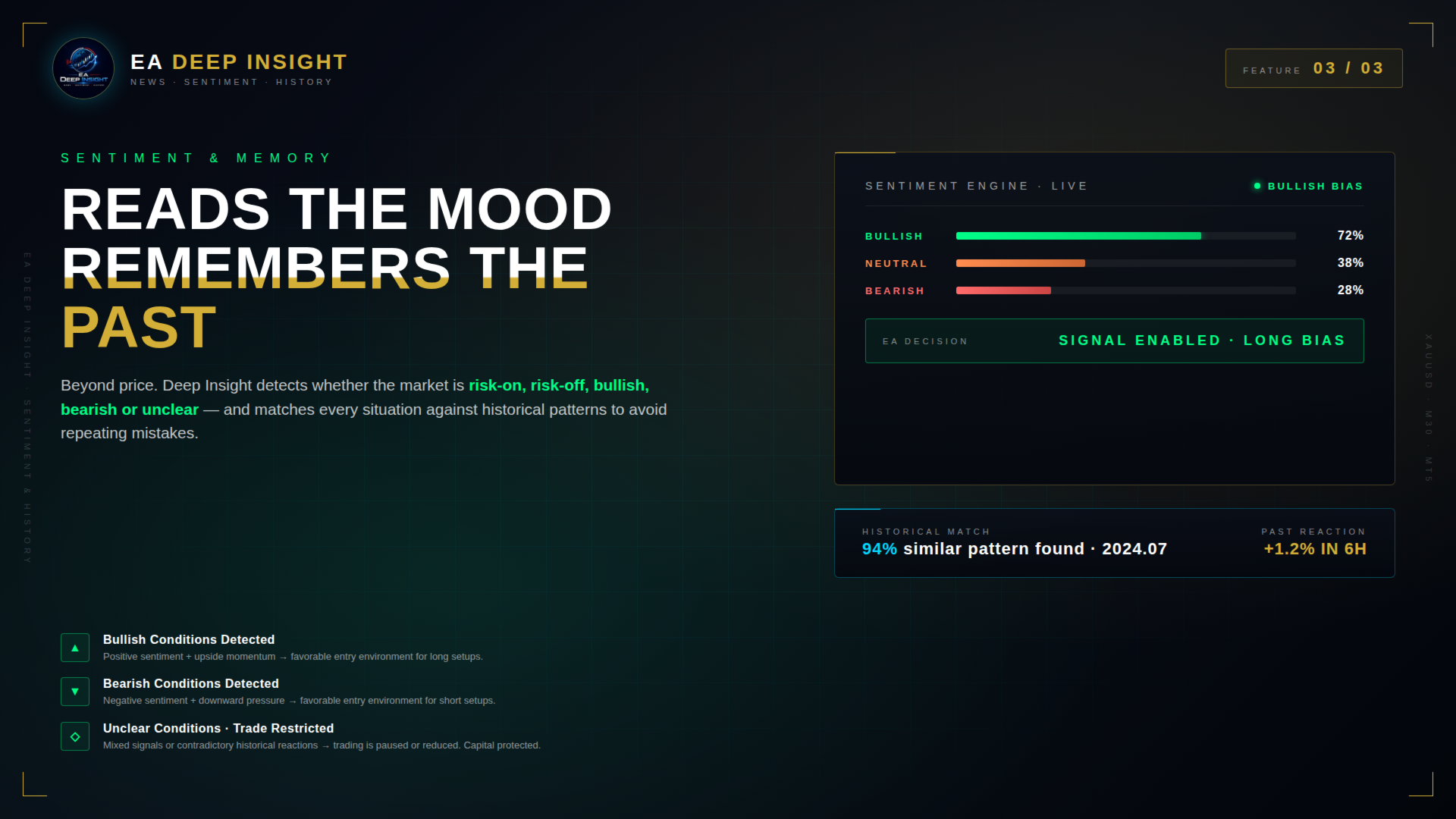 Durch den Fokus auf den emotionalen und fundamentalen Ton des Marktes soll Deep Insight Handelsentscheidungen aus einer breiteren Marktperspektive treffen.