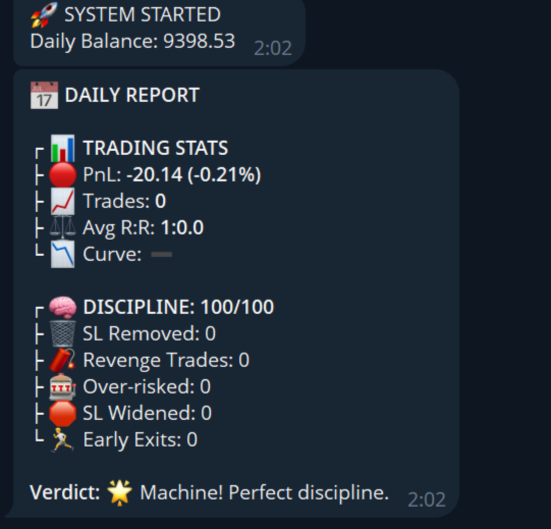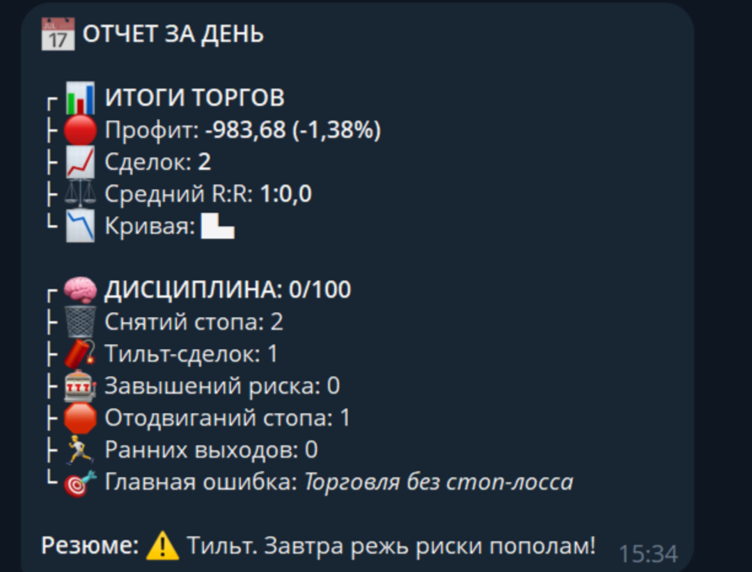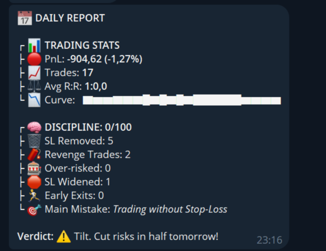 Discipline Diary: Ein einzigartiges System, das Ihre Aktionen verfolgt. Für jeden Verstoß (zu hohes Risiko, Ausdehnung eines Stop Loss usw.) werden Strafpunkte vergeben. Am Ende des Tages erhalten Sie einen detaillierten Bericht in Telegram mit einer Bewertung Ihrer Disziplin.