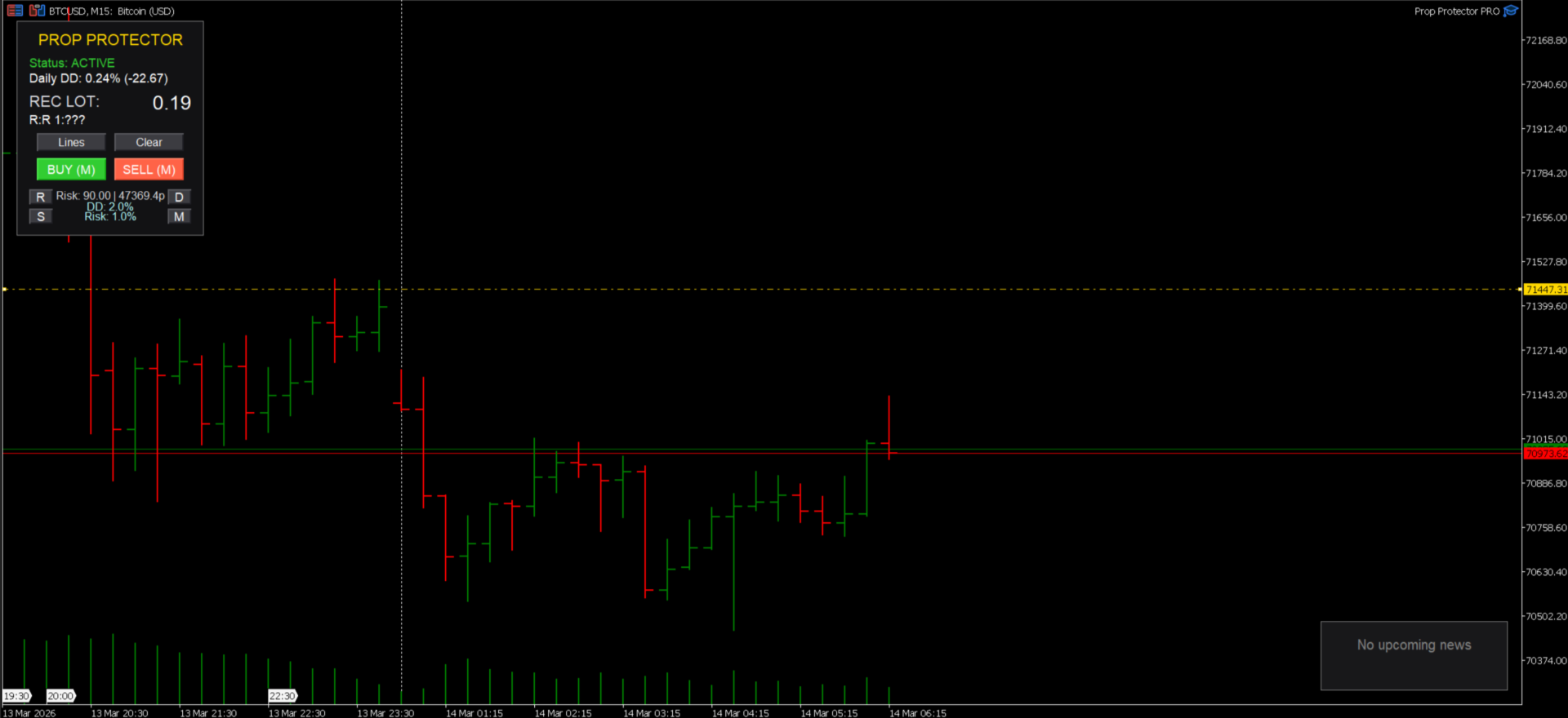 Dynamische Lot-Berechnung: Vergessen Sie Taschenrechner. Platzieren Sie Ihren Stop-Loss auf dem Chart, und der EA berechnet sofort die Positionsgröße auf der Grundlage Ihres Risikos pro Handel (%), des täglichen Drawdowns und der bereits offenen Positionen.