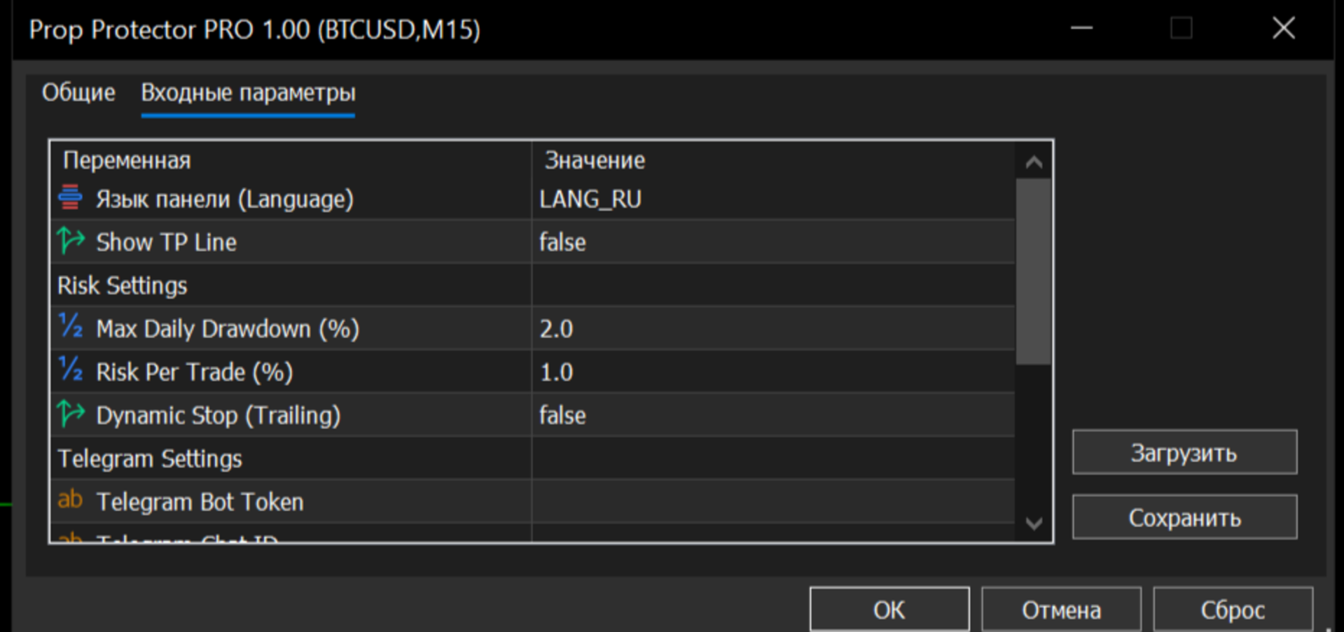 Setup: Legen Sie Ihre wichtigsten Risikoparameter in den Eingabeeinstellungen fest (Risiko pro Handel, maximaler täglicher Drawdown).