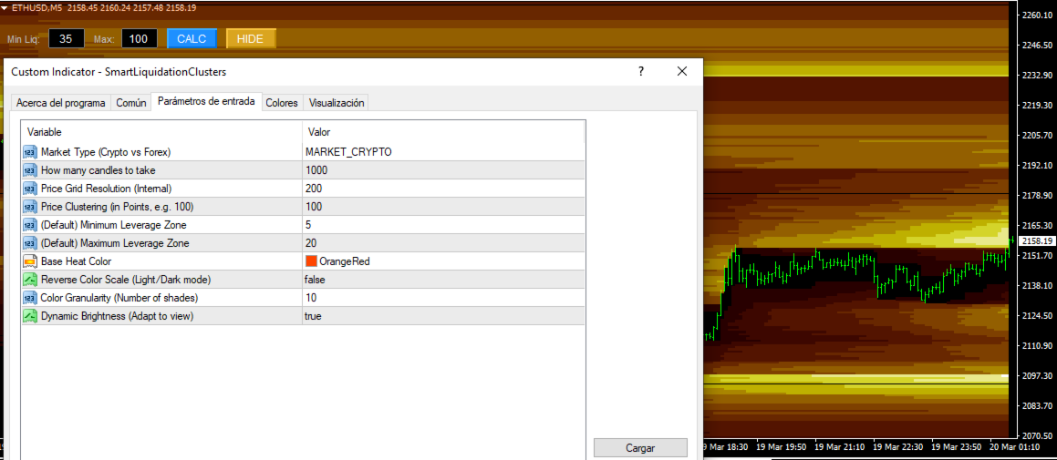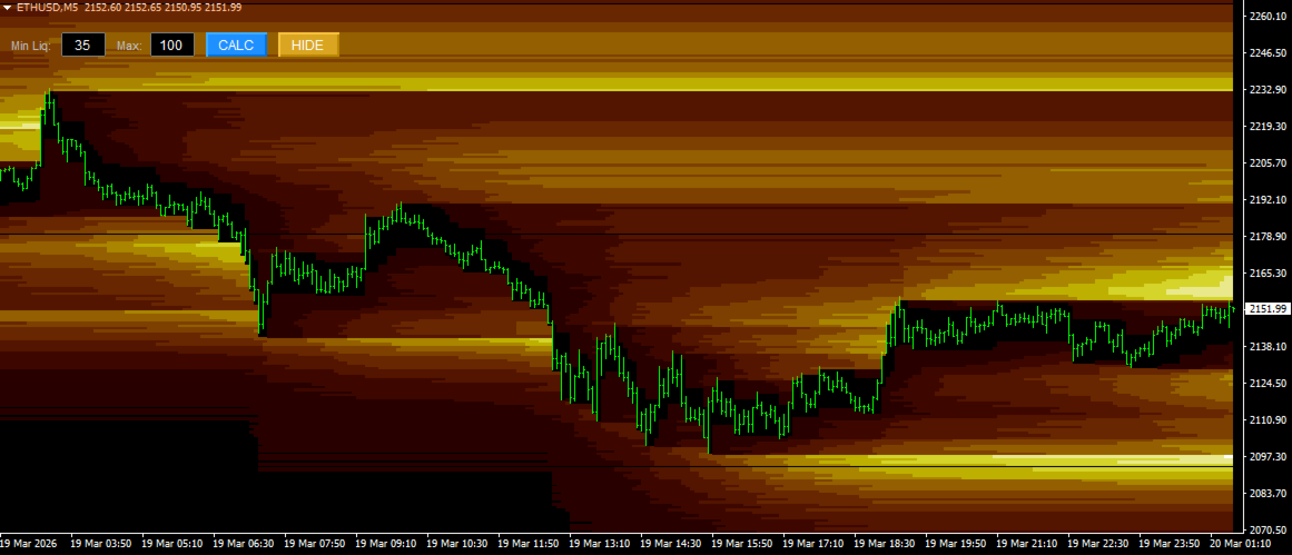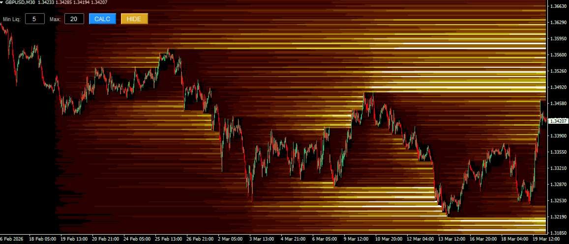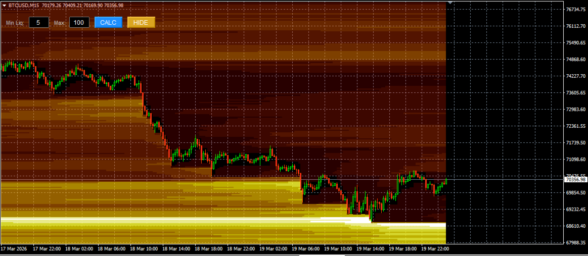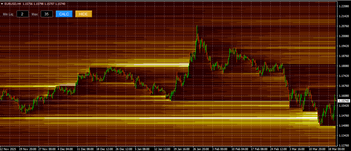 Der Smart Liquidation Clusters ist ein benutzerdefinierter technischer Indikator, der für die Plattform MetaTrader 4 (MT4) entwickelt wurde. Er berechnet und visualisiertgeschätzte Liquidationszonen auf der Grundlage von Preisbewegungen und internen Algorithmen und zeigt sie als dynamische Heatmap auf dem Chart an.