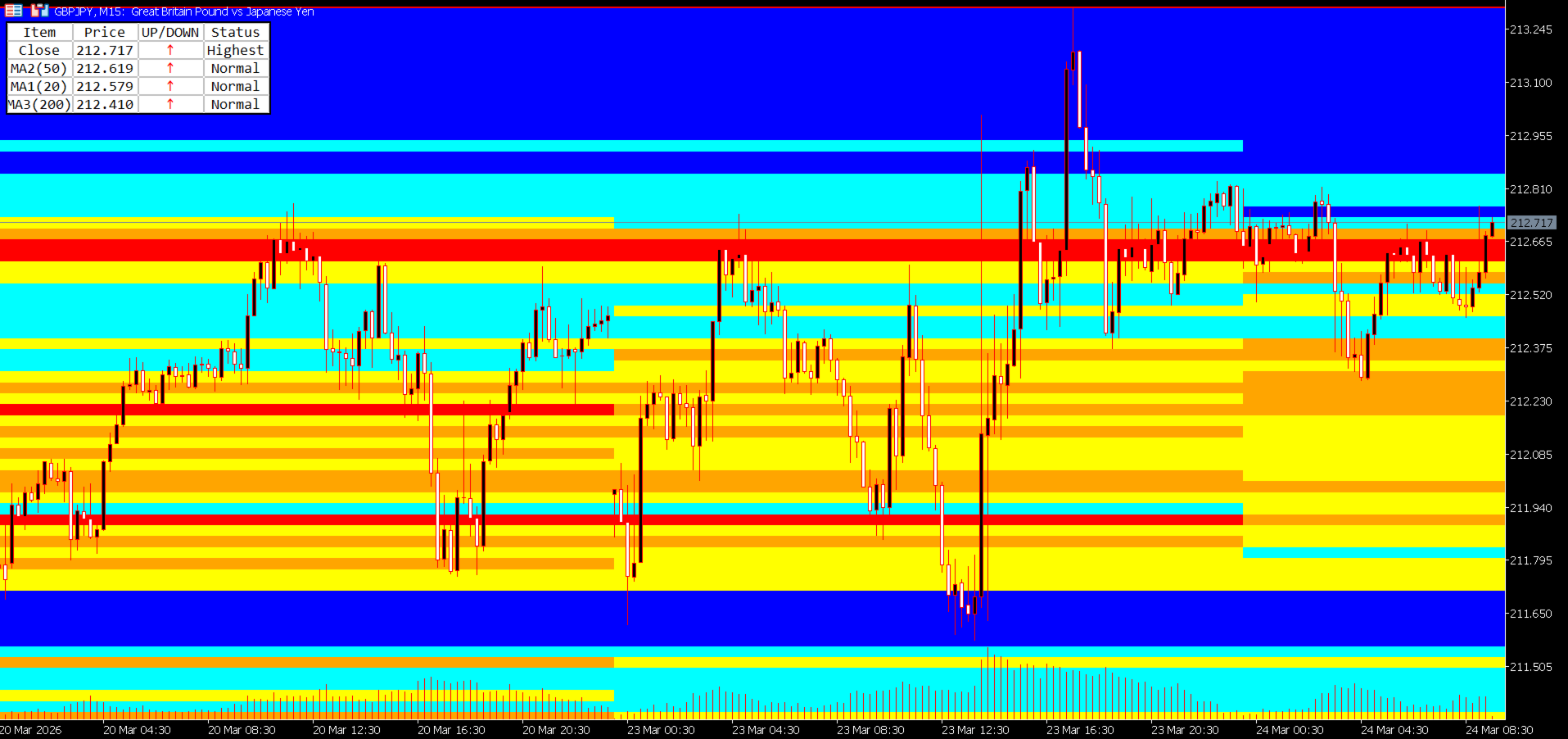 - Anzeige überprüfen: Sobald die Heatmap, die Hoch/Tief-Linien und die MA-Tabelle auf dem Chart erscheinen, ist die Einrichtung abgeschlossen.