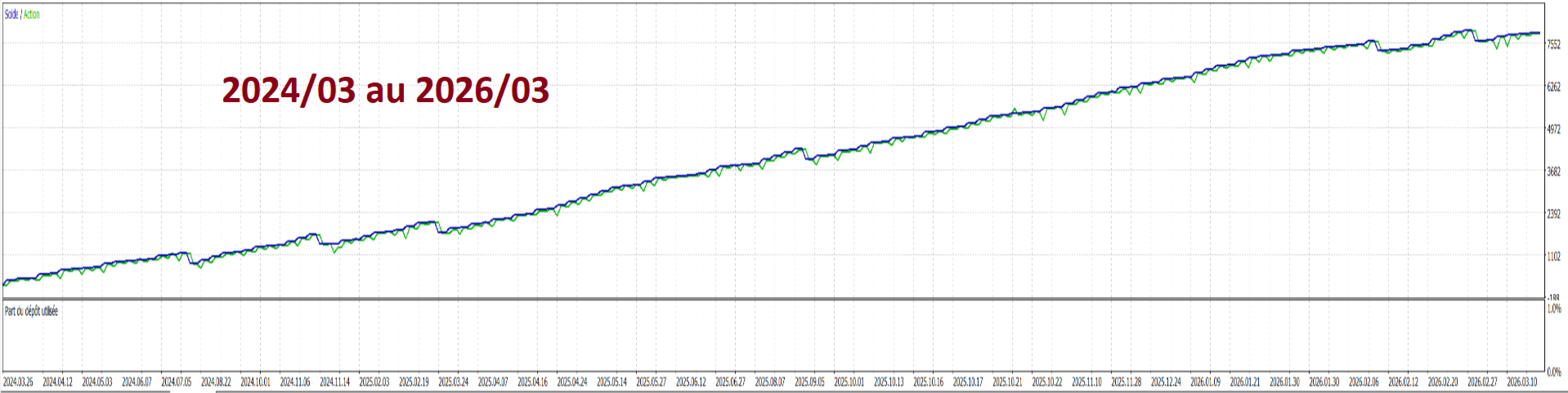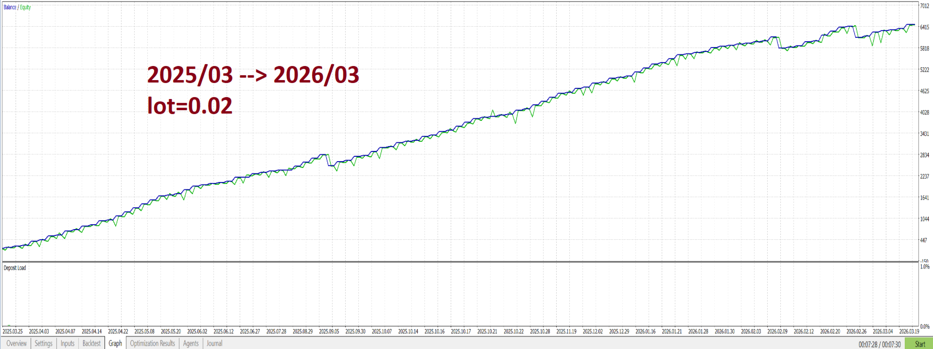 Der Roboter verwendet einenproprietären Algorithmus, der Multi-Timeframe-Trendanalyse und dynamisches Positionsmanagement kombiniert . Seine interne Logik wurde in mehr als8.400 Testläufen optimiert, um die robustesten Konfigurationen für XAUUSD M5 zu ermitteln.