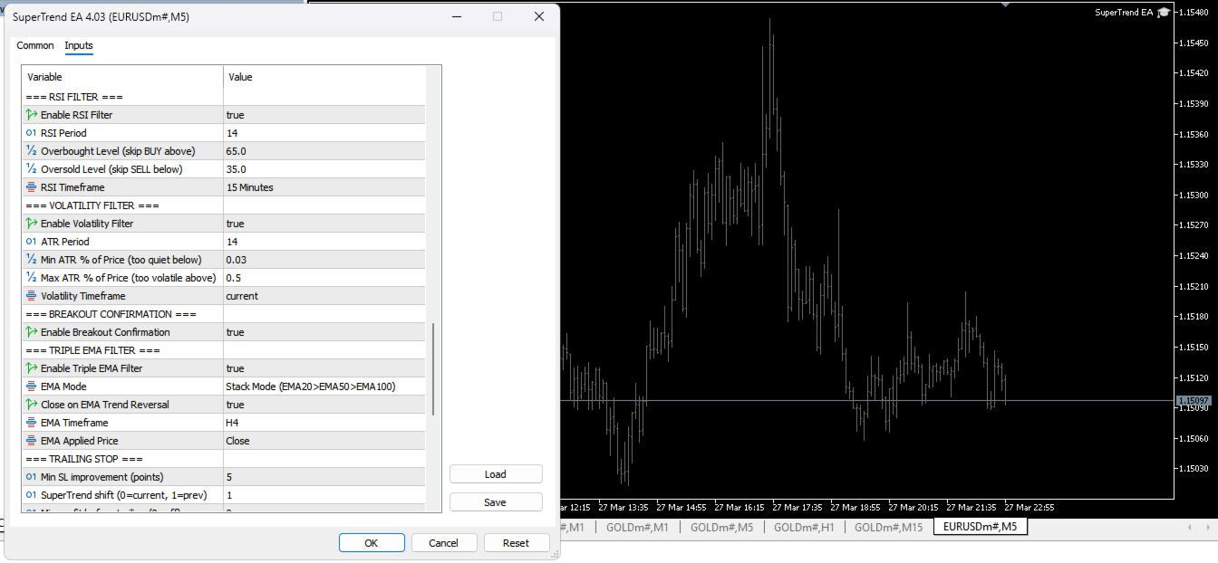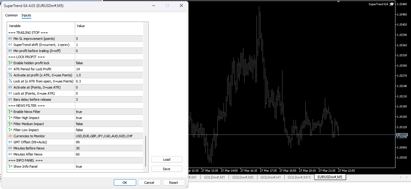 SuperTrend EA v4.03 ist ein vollautomatischer, professioneller Expert Advisor für MetaTrader 5, der auf dem bewährten SuperTrend-Indikator aufbaut, einem der zuverlässigsten und bewährtesten Trenderkennungsinstrumente der technischen Analyse. Er identifiziert präzise Trendumkehrungen und steigt zum optimalen Zeitpunkt in den Markt ein, was Ihnen einen echten Vorteil beim Handel mit Devisenpaaren und Gold (XAUUSD) verschafft.