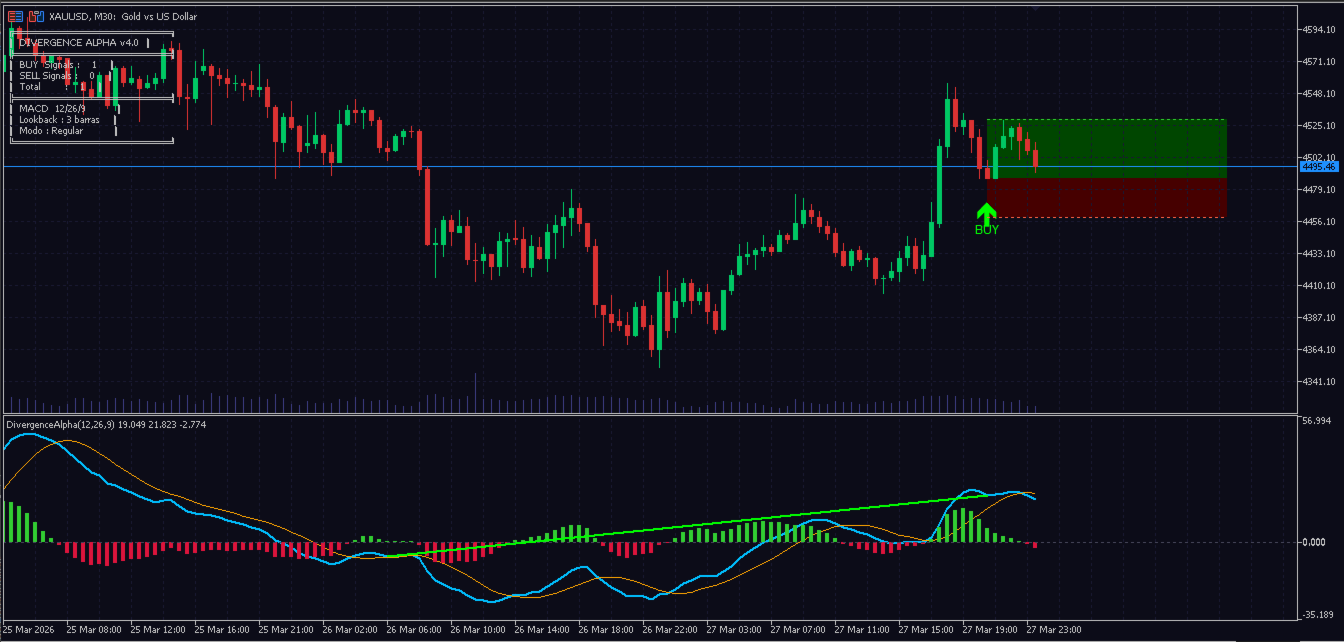 DivergenceAlpha ist ein fortschrittlicher MACD-Divergenz-Indikator für MetaTrader 5. Er kombiniert den klassischen MACD mit der automatischen Erkennung von regelmäßigen und unregelmäßigen Abweichungen und bietet klare visuelle Signale sowie Take Profit (TP) und Stop Loss (SL) auf Basis der ATR.
