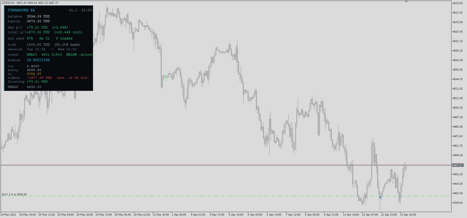 Turnaround EA ist ein regelbasierter algorithmischer Expert Advisor für MetaTrader 5, der auf einem der am besten dokumentierten wöchentlichen saisonalen Muster auf dem Devisenmarkt basiert - der Tendenz zur Mittelwertumkehr zu Wochenbeginn. Der EA eröffnet eine einzelne Long-Position zu einer konfigurierten Zeit an einem ausgewählten Einstiegstag, hält sie über die gesamte Woche und schließt sie automatisch zu einer voreingestellten Ausstiegszeit. Kein Ermessensspielraum. Keine verpassten Signale. Reine Automatisierung.