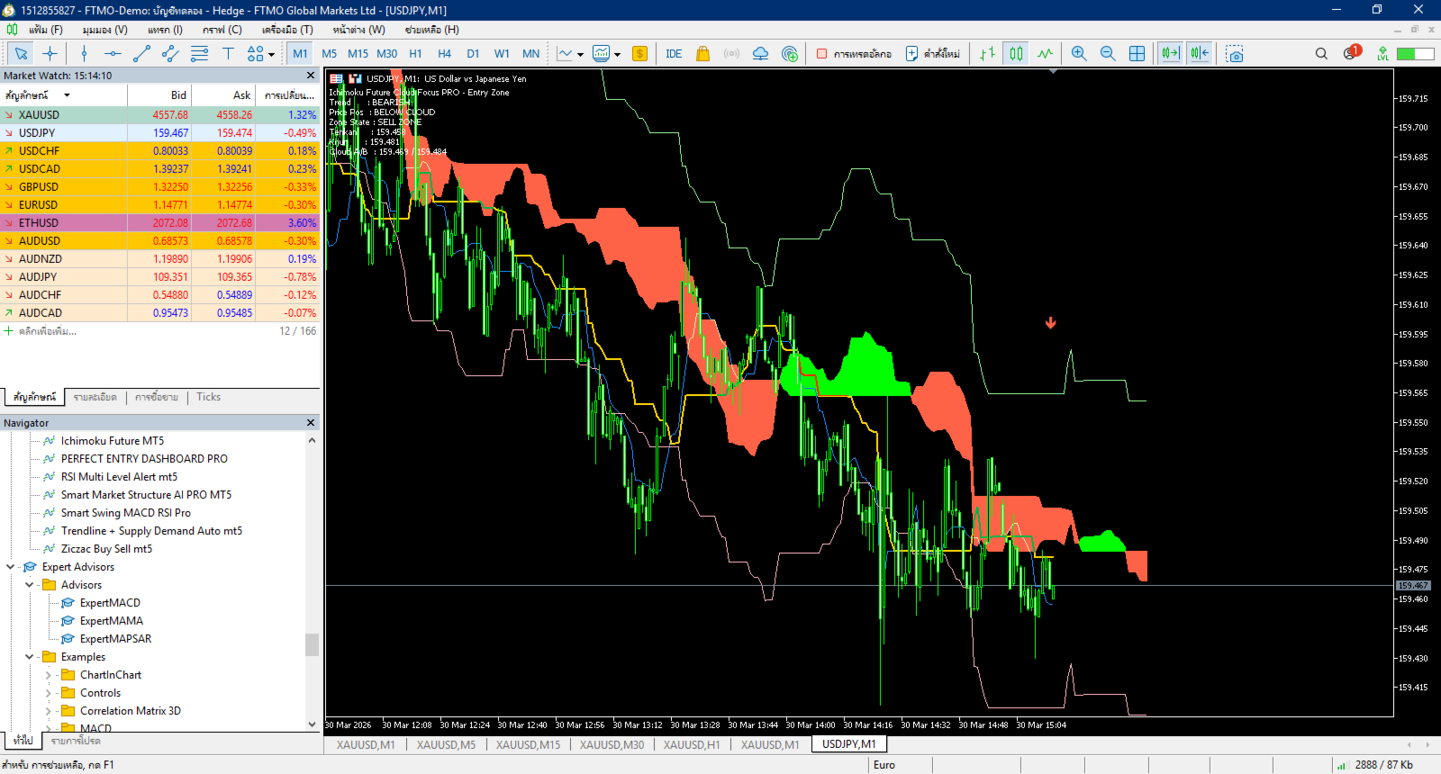 อินดิเคเตอร์นี้พัฒนาจาก Ichimoku ปกติ แต่เพิ่ม "โซนเข้าออเดอร์ (Entry Zone)" + "การมอง Cloud ล่วงหน้า" เพื่อให้ตัดสินใจง่ายขึ้น