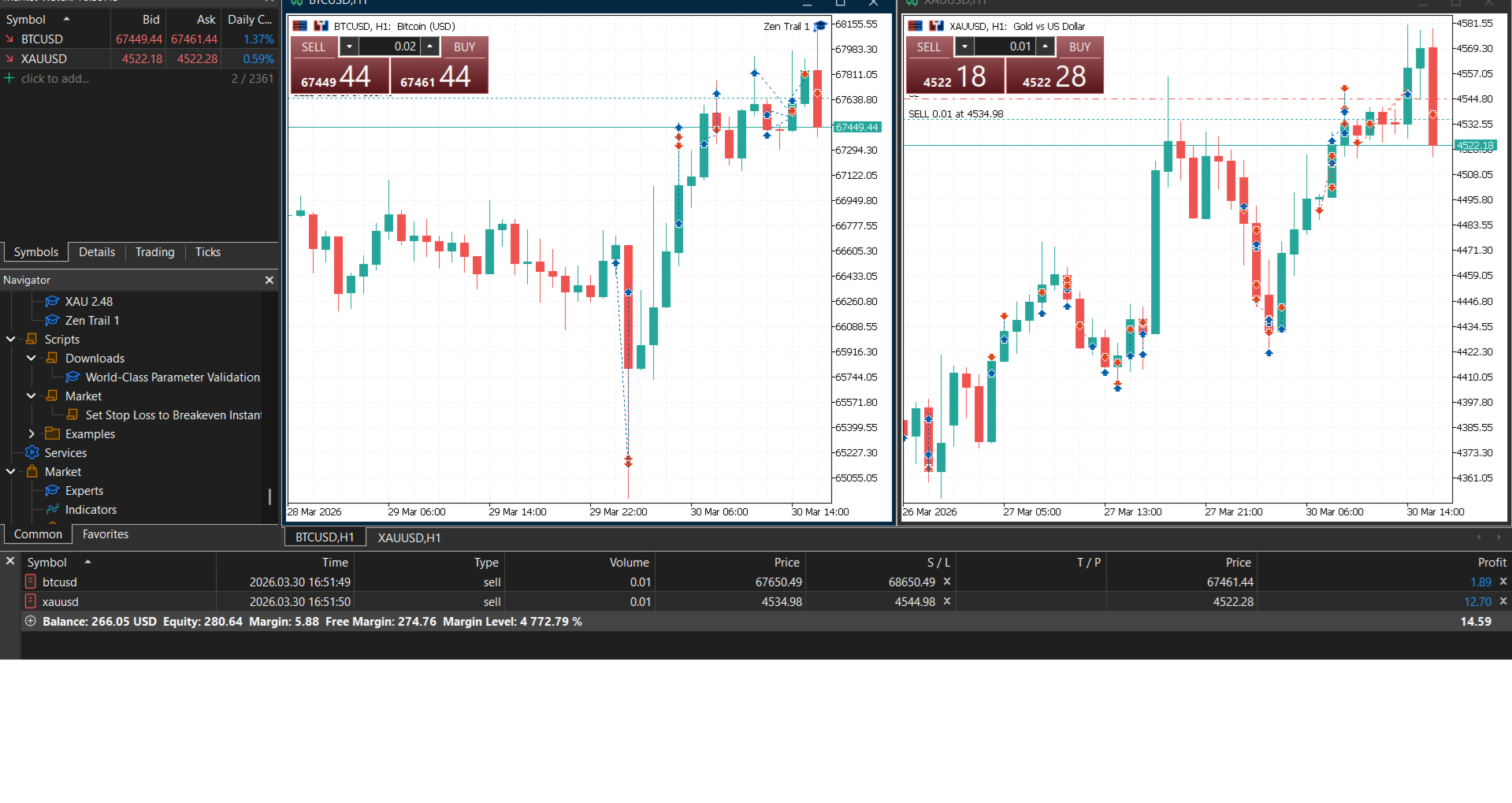 Einzelchart: Installieren Sie Zen Trail in einem einzigen Fenster (z.B. EURUSD) und es verwaltet gleichzeitig Gold (XAUUSD), Bitcoin (BTCUSD) und jedes andere Symbol auf Ihrem Market Watch. Sie müssen nicht für jedes Asset einen eigenen Chart öffnen.