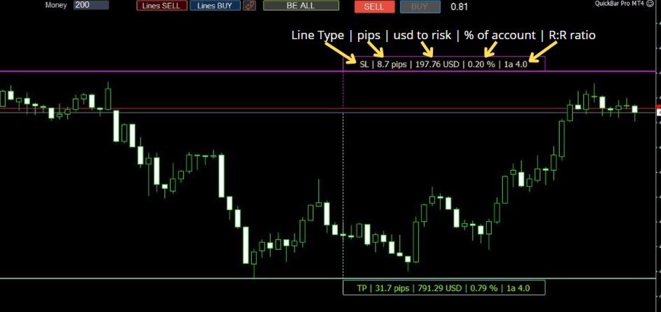 QuickBar Pro berechnet die Lotgröße automatisch auf Basis des gewählten Risikoprozentsatzes oder eines festen USD-Betrags. Stop-Loss- und Take-Profit-Linien sind direkt im Chart verschiebbar und aktualisieren sich in Echtzeit mit Pips, USD-Wert, Kontoanteil und Chance-Risiko-Verhältnis. Die Risikoeinstellungen werden zwischen Sitzungen über globale Variablen gespeichert, sodass das Tool Ihre Einstellungen bei jedem Öffnen des Terminals beibehält.