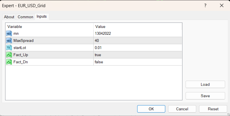 - MaxSpread - Spread-Filter: Neue Orders werden nur zugelassen, wenn MODE_SPREAD für EURUSD genau unter diesem Wert liegt (Punkte, wie vom Terminal für das Symbol gemeldet).
