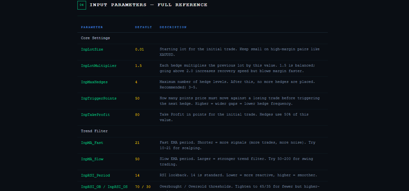 RSI bestätigt werden, und verwaltet dann jede Position mit Break-Even-Automatik, Trailing-Stops
