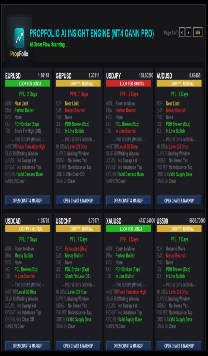 Verbringen Sie nicht länger Stunden damit, Charts manuell zu scannen. Die Propfolio Trade Insight Engine ist ein analytisches Dashboard und automatisches Markup-Dienstprogramm, das speziell für SMC-, ICT-, BTMM- und Prop Firm-Händler entwickelt wurde.