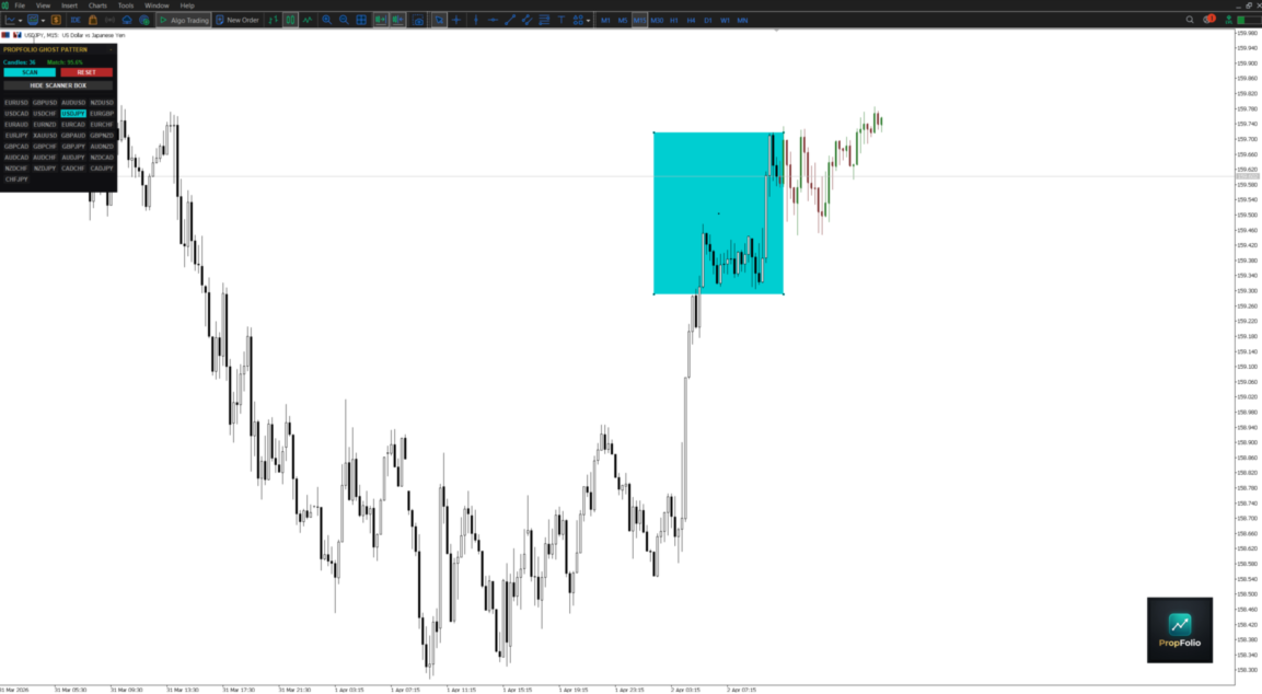 Das Propfolio Ghost Pattern ist ein fortschrittlicher Algorithmus, der Muster abgleicht. Sie ermöglicht es Ihnen, eine beliebige aktuelle Preisaktionsstruktur auf Ihrem Chart auszuwählen und sofort Tausende von historischen Kerzen zu scannen, um den exakten Zeitpunkt in der Vergangenheit zu finden, an dem der Markt genau dasselbe getan hat.